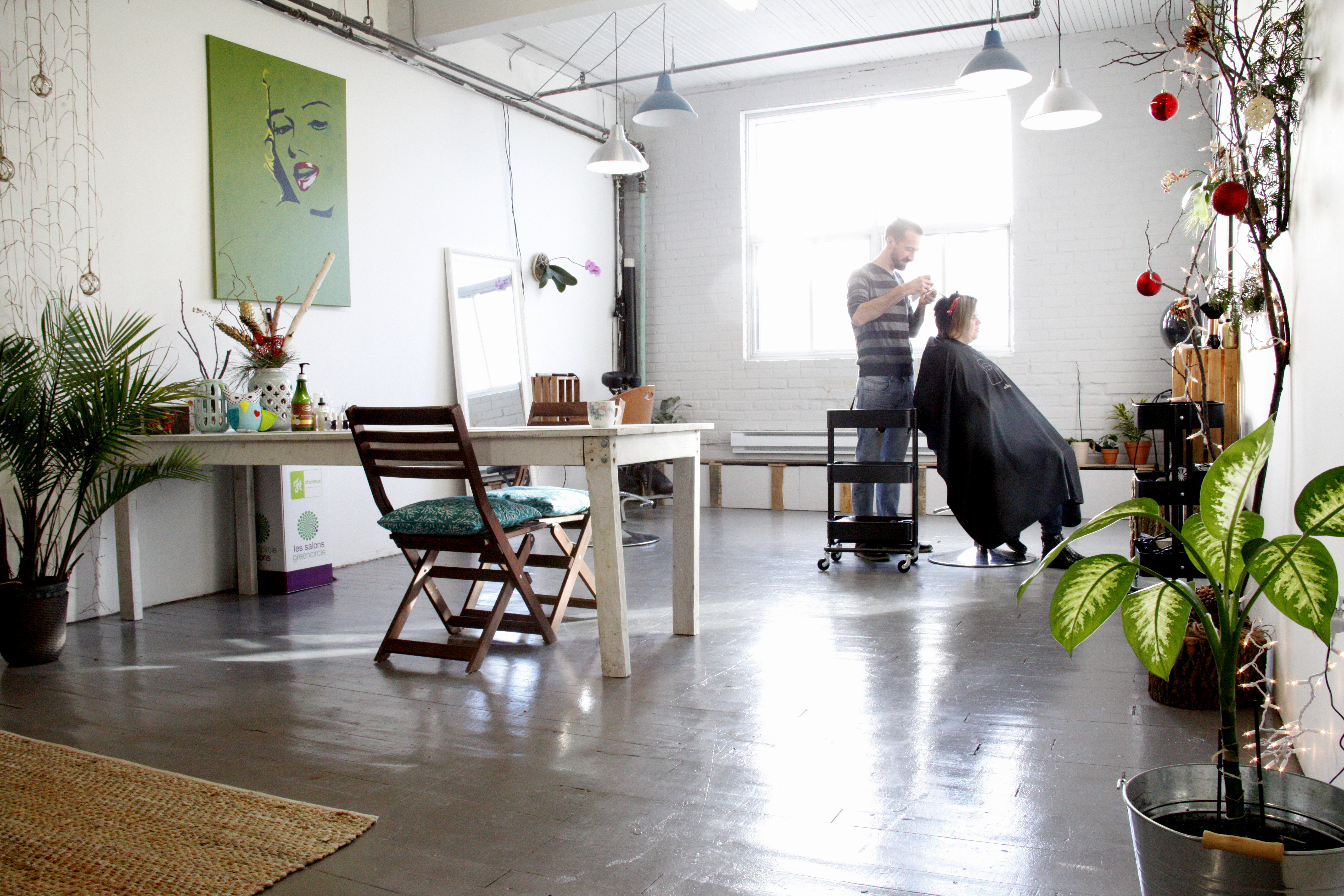 Pour amortir le coût de certains investissements écologiques, le fondateur du salon a fait sa décoration avec des matériaux de récupération. Il assure que ce virage vert n’est pas si dispendieux et que cela n’a pas fait gonfler ses tarifs.
