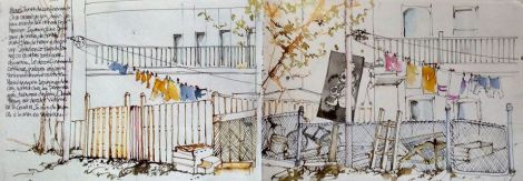 Quand la température est clémente, elle se promène à pied et se campe dehors pour dessiner. «Cet hiver, il faisait froid ou il pleuvait, alors je m’installais dans mon auto, raconte-t-elle. Je fais un peu de repérage de cette façon-là aussi parce que le quartier est grand.»