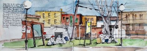 L’artiste fait partie de la communauté mondiale de dessinateurs «Urban Sketchers» qui rassemble autant des professionnels que des amateurs, . «On se réunit entre amis pour dessiner la ville, explique-t-elle. Et une fois par deux ans, le groupe vient dans Hochelaga-Maisonneuve.»
