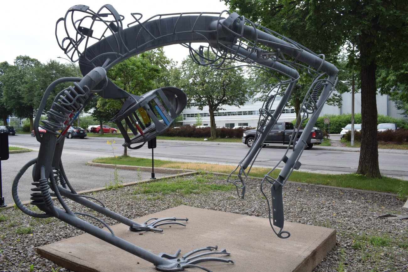 Cette sculpture de Philippe Allard est implantée au siège du Cirque du soleil. La souplesse de ce qui ressemble à un robot peut faire penser aux contorsions faites par les circassiens.