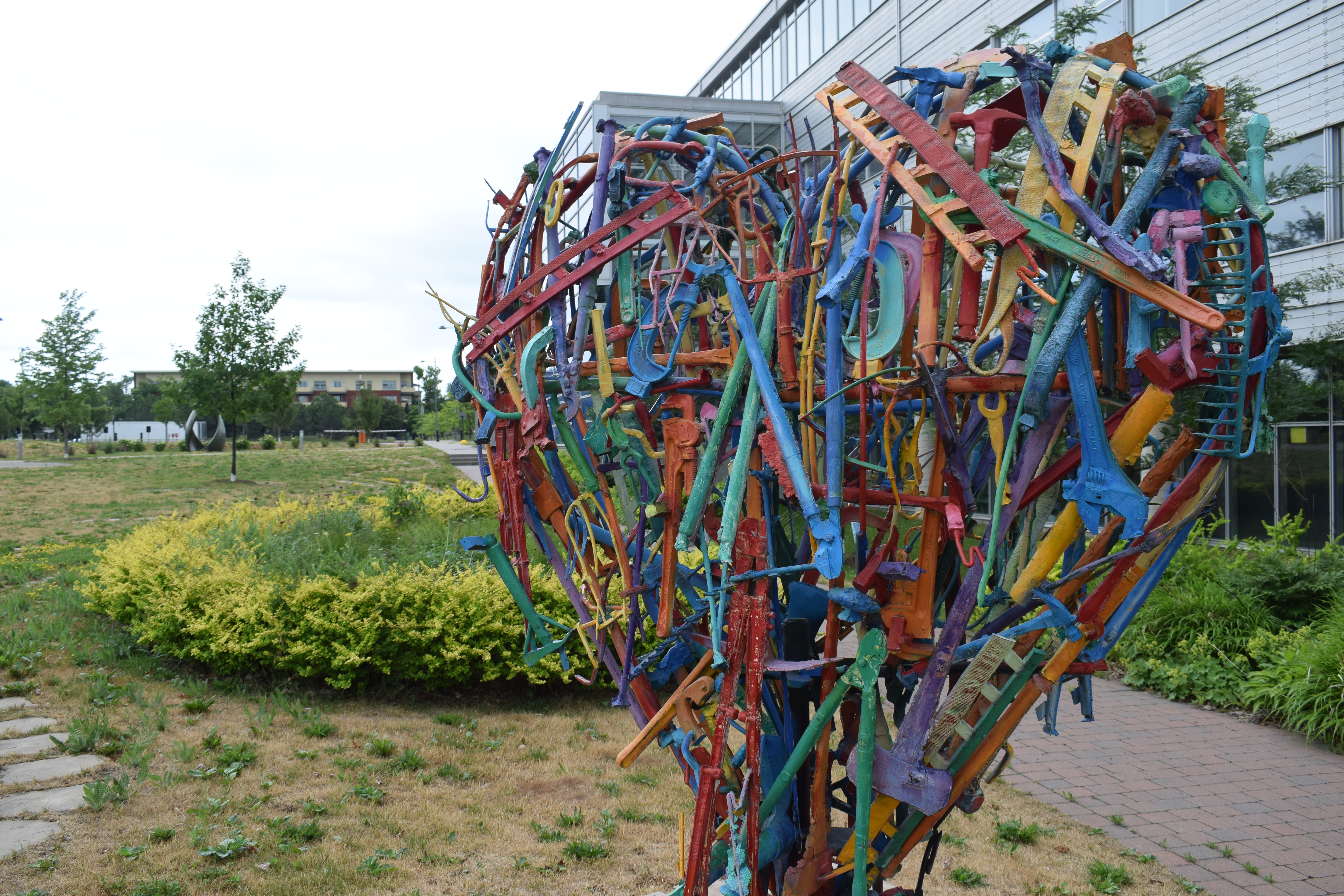 Cette sculpture de Philippe Allard est implantée au siège du Cirque du soleil. La souplesse de ce qui ressemble à un robot peut faire penser aux contorsions faites par les circassiens.