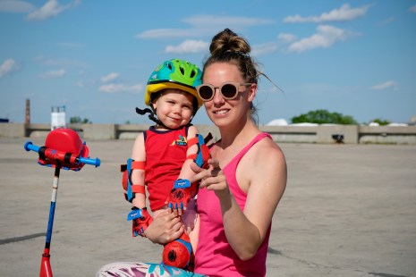 Caroline et Zachary, qui ont respectivement 32 ans et deux ans, s’amusent à proximité du Stade olympique. Zachary célèbre sa fête aujourd’hui à coups de trottinette et de rires.