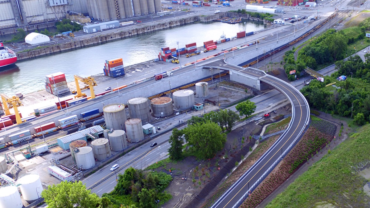 Le Port de Montréal a récemment inauguré son nouveau pont d’étagement, situé au-dessus de la rue Notre-Dame Est dans le secteur Viau. Cette réalisation a pour principal objectif de désengorger le réseau routier en déviant près de 1500 camions par jour, augmentant ainsi l’efficacité et la fluidité du transport des marchandises. Les travaux auront duré deux ans.