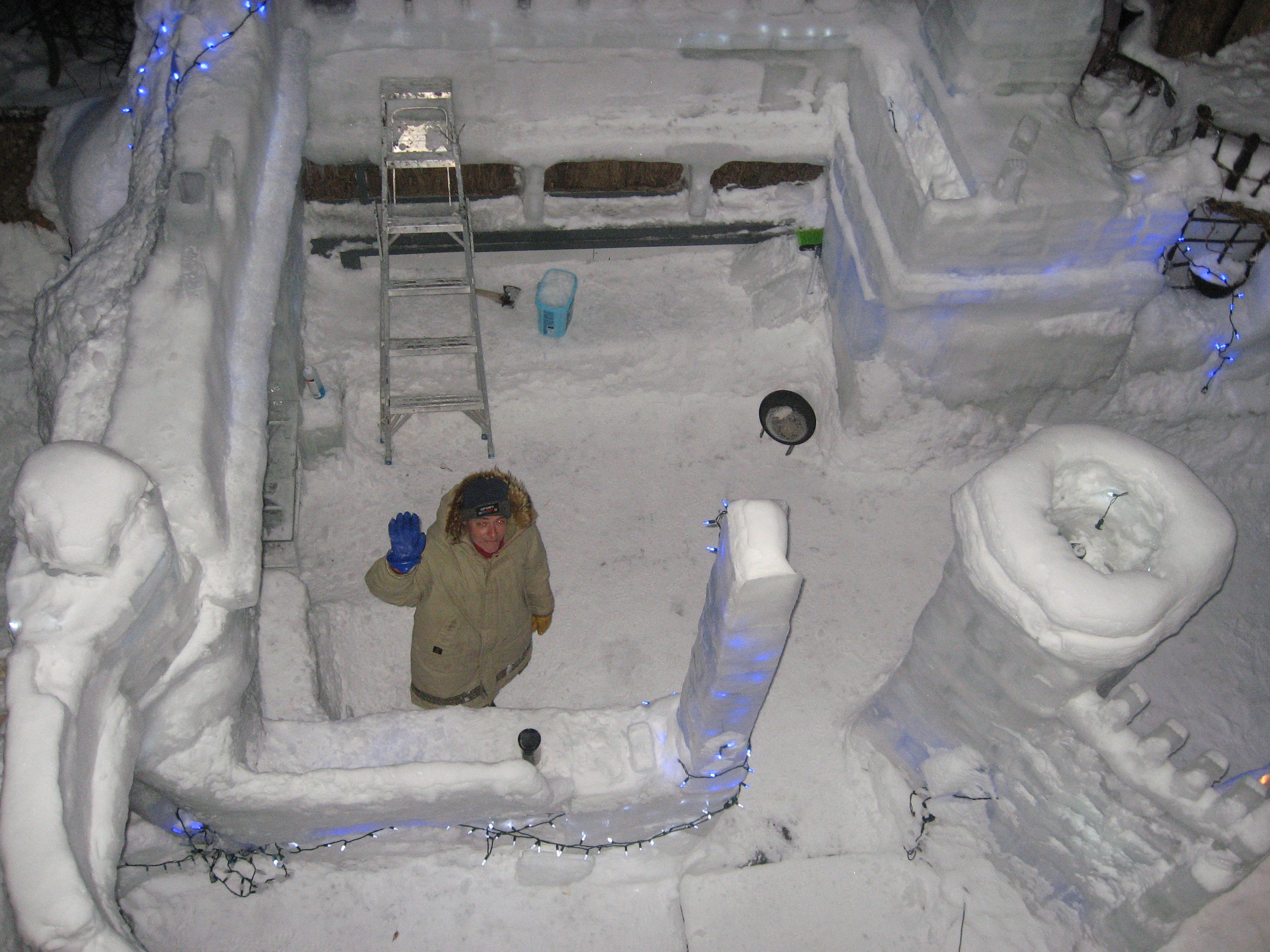 Les froides températures lui ont permis de réaliser ses idées de grandeur en créant un château, plus haut et plus grand que par le passé, aux allures médiévales avec palissade et tour crénelée.