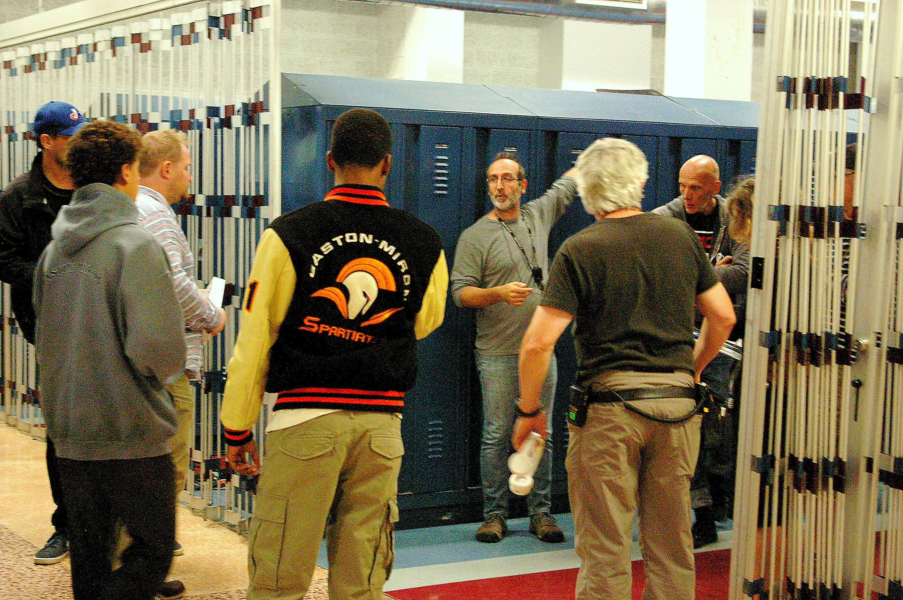 Aujourd’hui, le tournage se fait dans la salle des casiers. La cinquantaine de techniciens et la dizaine d’acteurs vont et viennent autour de ces fameux casiers bleu et rouge. D’abord, il y a l’installation technique, puis on explique la scène à tout le monde, vient ensuite le tour des éclairagistes de régler leurs machines et enfin, on tourne. L’assistant réalisateur annonce : « Dans 1, 2, Action ».
