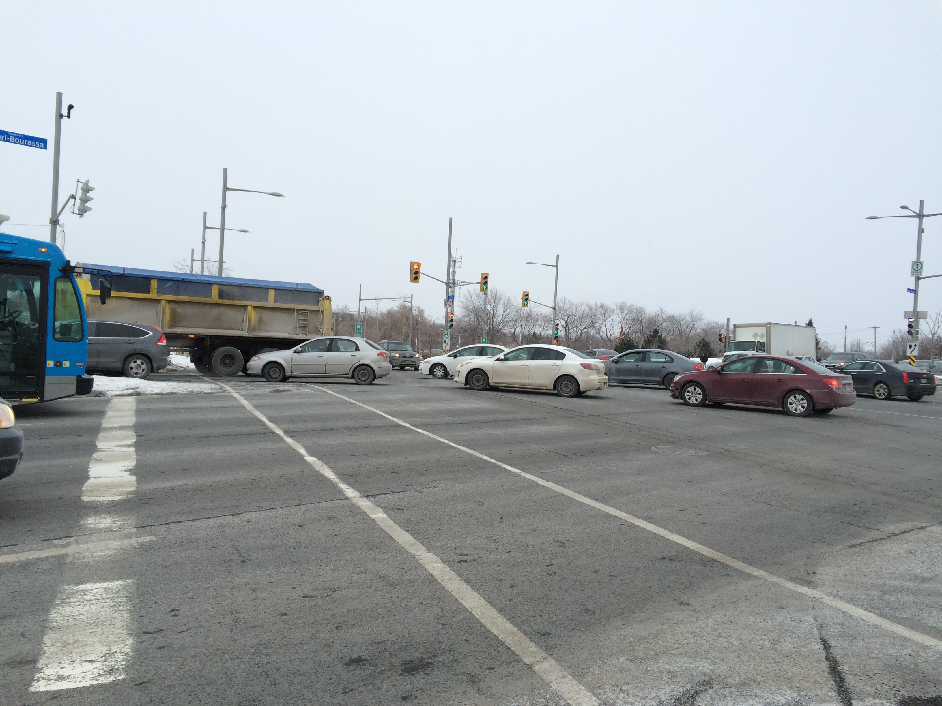 À l’heure de pointe, le carrefour des boulevards Henri-Bourassa et Pie-IX est un vrai nœud de circulation. Après avoir traversé au feu vert le boulevard Pie-IX, les véhicules qui circulent en direction est sur le boulevard Henri-Bourassa se butent, quelques mètres plus loin, au feu rouge de la rue Hébert. Coincés, les véhicules ne peuvent libérer l’espace sur la voie, créant ainsi un bouchon entre les deux intersections.