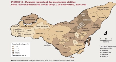 Sur une carte intégrée au rapport, on constate que Montréal-Nord fait partie des endroits où la proportion de ménages rapportant des moisissures visibles se situe entre 11,1 % et 15 %, alors que la moyenne de l’île de Montréal est de 8,6 %. Il a été impossible d’obtenir la proportion exacte de ménages touchés dans l’arrondissement.