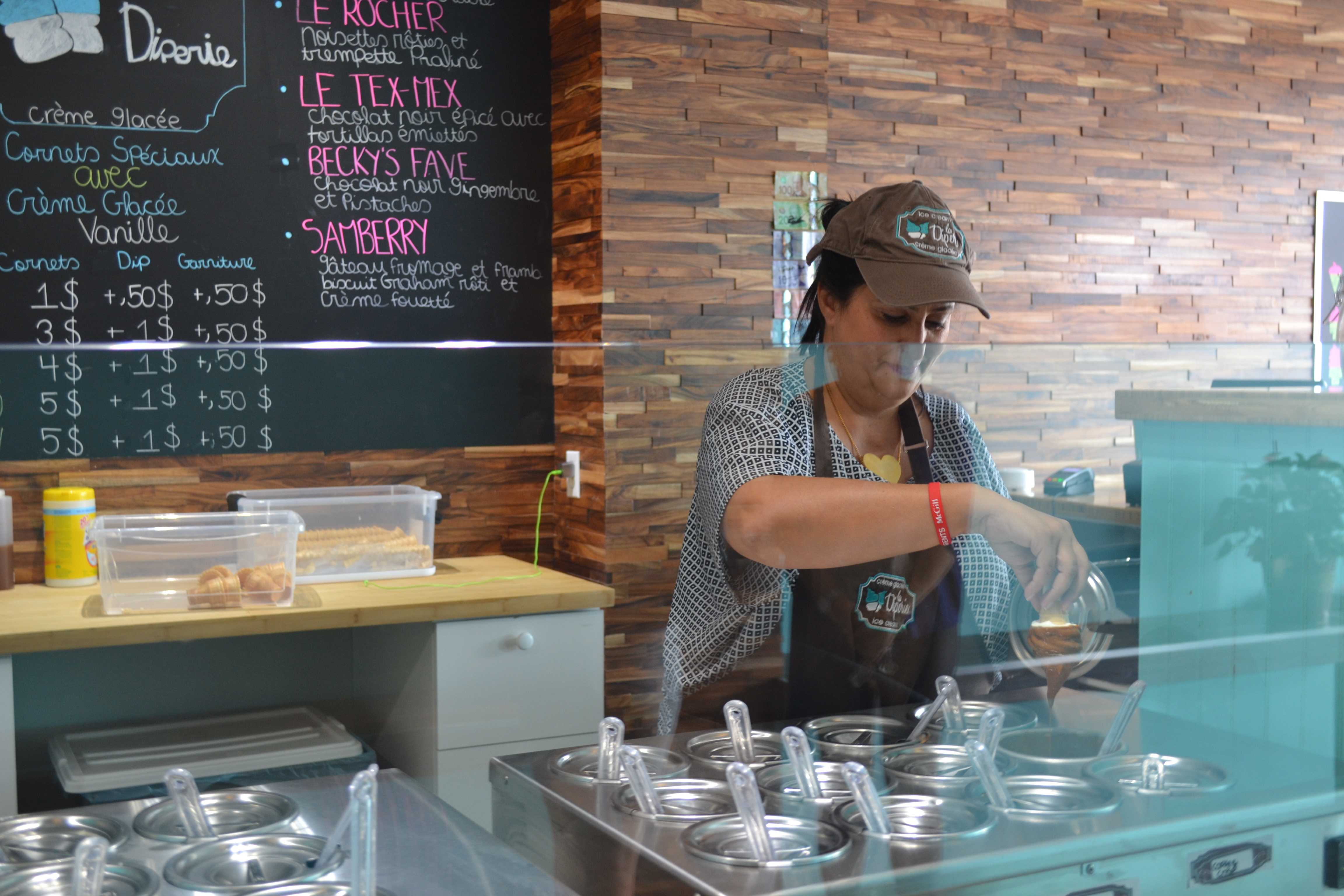 Le commerce offre une crème glacée molle à la vanille qu’il est possible de tremper, [dip en anglais, d’où le nom du commerce] dans 24 saveurs différentes de chocolat.