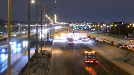 Vers 22h, un camion semi-remorque a d’abord fait une mise en porte-feuille bloquant toutes les voies à la hauteur de l’avenue Victor-Davis jusqu’à 12h30, dimanche matin. Les policiers ont dû intervenir pour cinq autres accidents impliquant des voitures dans le même secteur. La chaussée était glissante en raison d’une légère chute de neige.