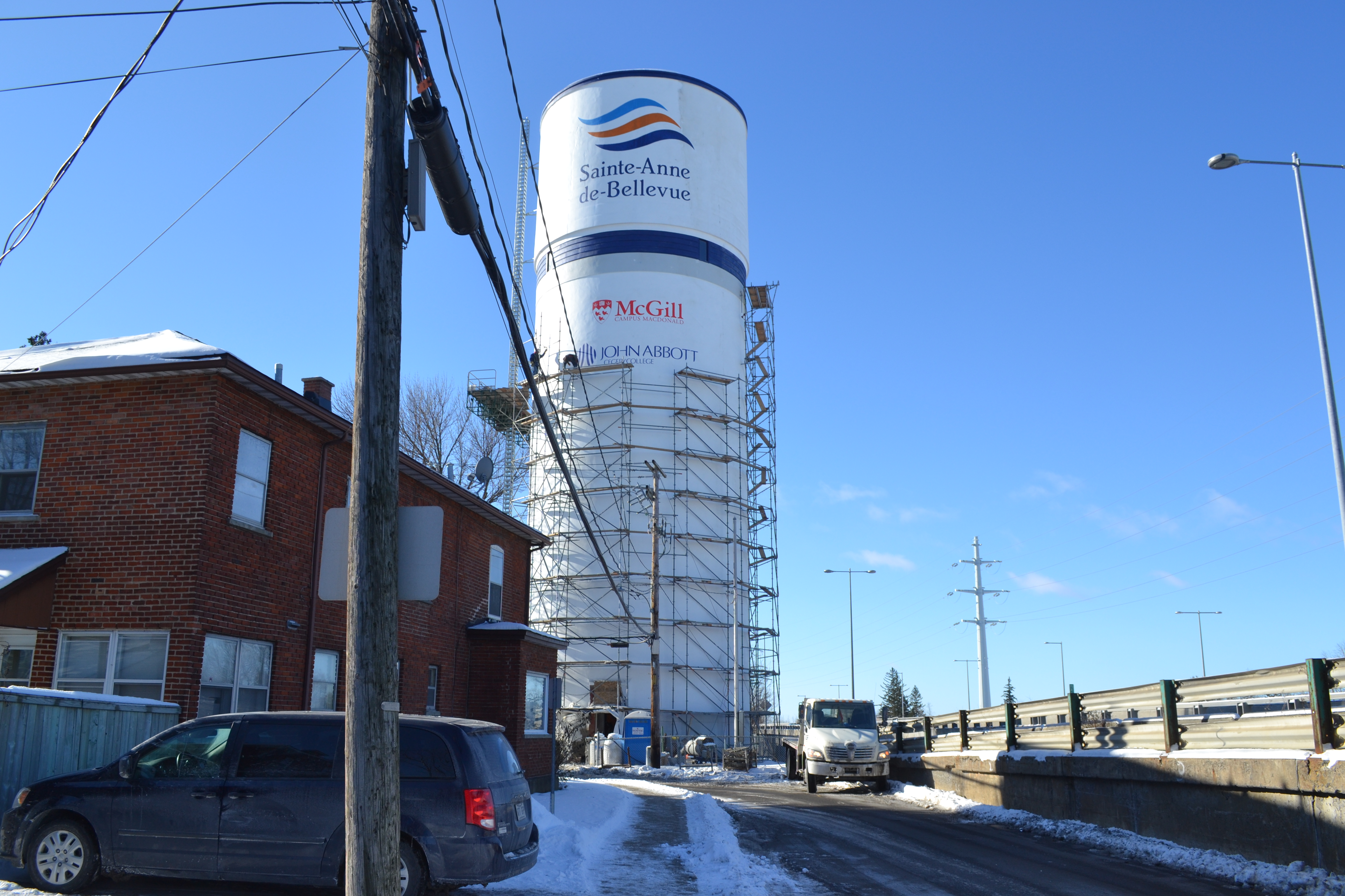 Depuis juin, des travailleurs s’affairent à peinturer la tour d’eau de Sainte-Anne-de-Bellevue, en bordure de l’autoroute 20. Les travaux sont presque complétés. Seuls certains détails restent à être faits, notamment les cadres des fenêtres au sommet de la tour ainsi que la porte. Le chantier pourrait se prolonger jusqu’au printemps en raison des conditions météo hivernales précoces.