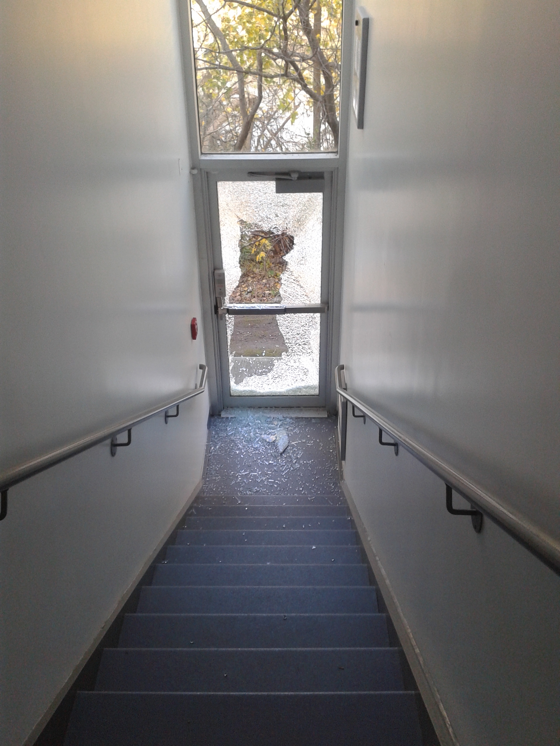 Un enseignant du département de pharmaceutique, en formation avec une dizaine d’étudiants, a entendu du bruit et est tombé sur un homme cagoulé et tout habillé en noir. Il fracassait la vitre d’une porte arrière du collège avec un marteau de démolition. Ce dernier a quitté les lieux aussitôt qu’il a vu le professeur.