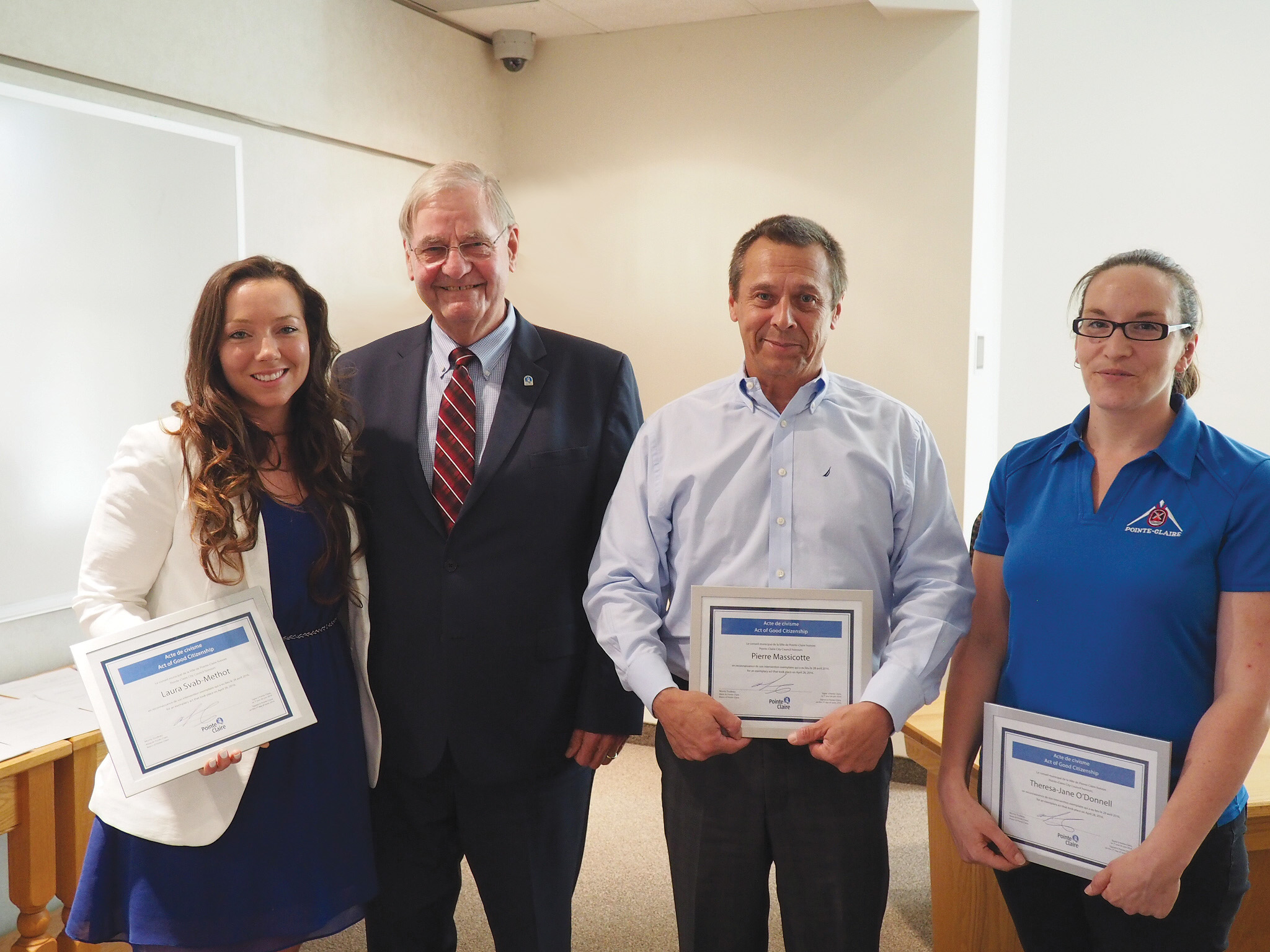 «Mmes O’Donnell et Svab-Methot et M. Massicotte ont agi avec discernement et fait preuve de dévouement et de courage pour sauver la vie de ce jeune garçon. Cet acte de civisme fait honneur à la Ville de Pointe-Claire», ajoute le maire Trudeau.