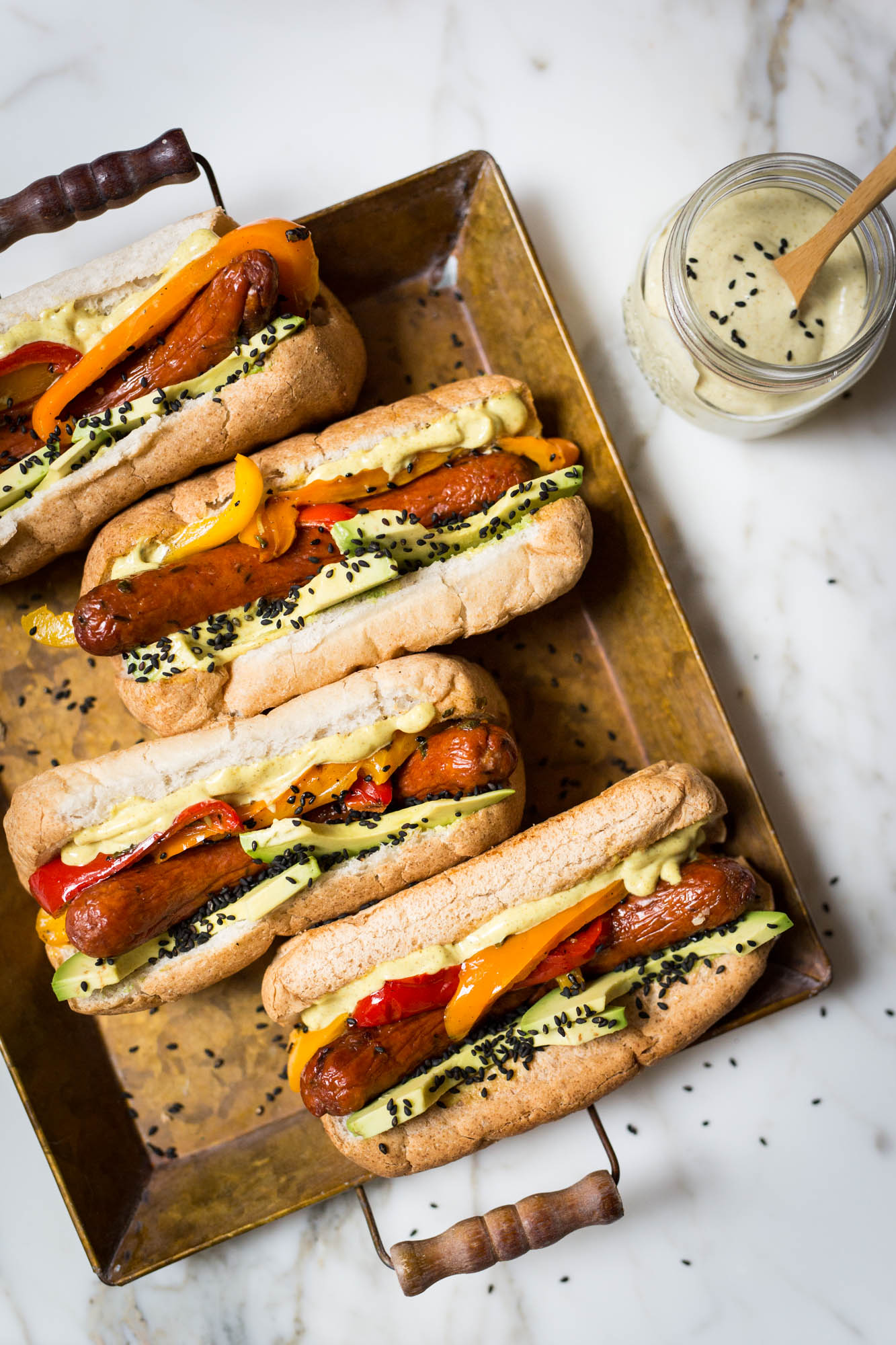 - Assembler les hot-dogs avec la mayo épicée, les poivrons grillés, les avocats et les graines de sésame.