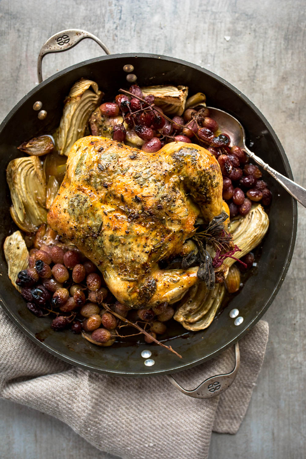 Faire un poulet grillé, ce n’est pas sorcier, même mon mari le fait très bien! Sa recette préférée : prendre des oignons et des herbes dans le frigo, mettre le tout dans un plat avec le poulet et hop au four! Pour ma part, je badigeonne le mélange d’herbes et de zeste sous la peau du poulet avant de le cuire et j’ajoute de belles grappes de raisin et du fenouil! Le dernier petit plus, j’arrose le poulet de vinaigre de cidre 10 minutes avant la fin de la cuisson. C’est le même poulet, mais en beaucoup plus beau! Le bonheur est dans les détails, je vous le dis! Bon appétit!