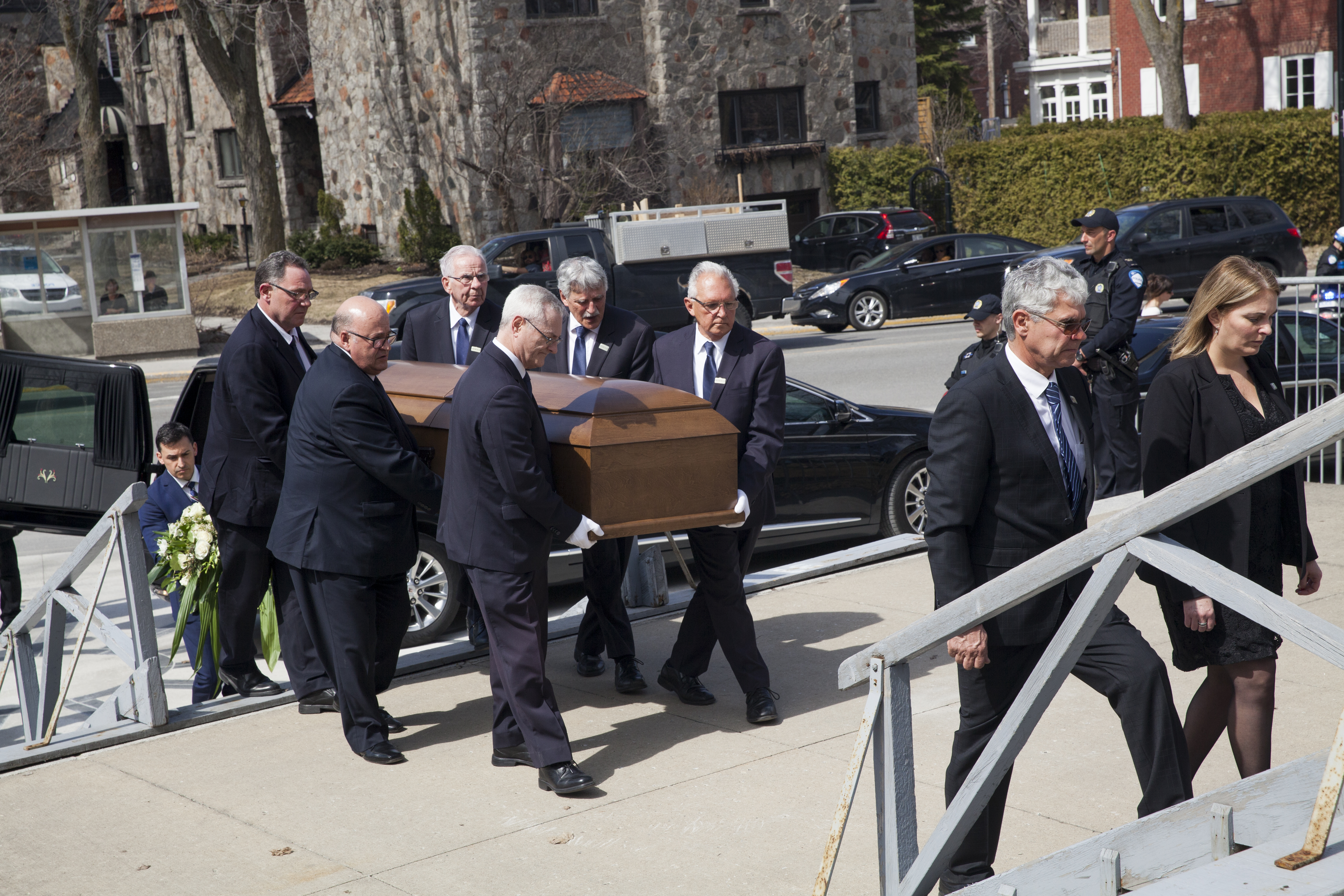 Sa fille Mireille Deyglun, son gendre Jean-François et ses petits-enfants, Sophie et Félix Lépine, ont accompagné le cercueil qui a été transporté par sept jeunes de la famille jusqu’à l’autel. Les funérailles de l’actrice décédée le 28 mars à l’âge de 95 ans étaient célébrées par le Monseigneur Christian Lépine.