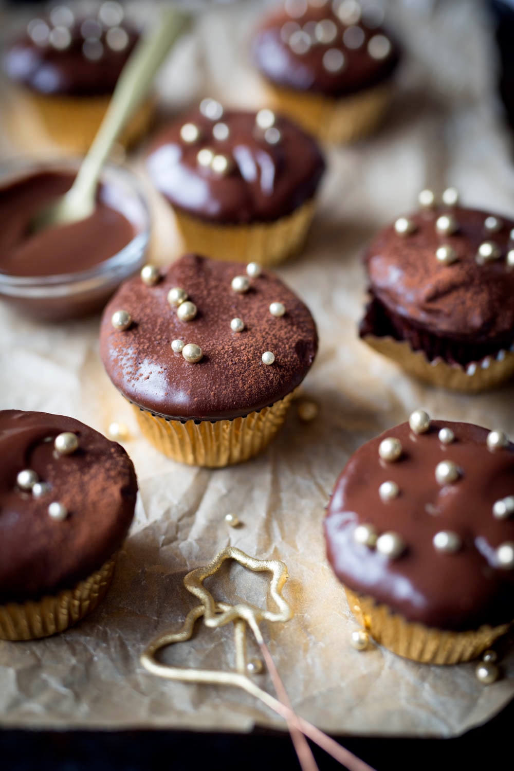 - Tremper le dessus des cupcakes dans la ganache et décorer avec des petites perles dorées.