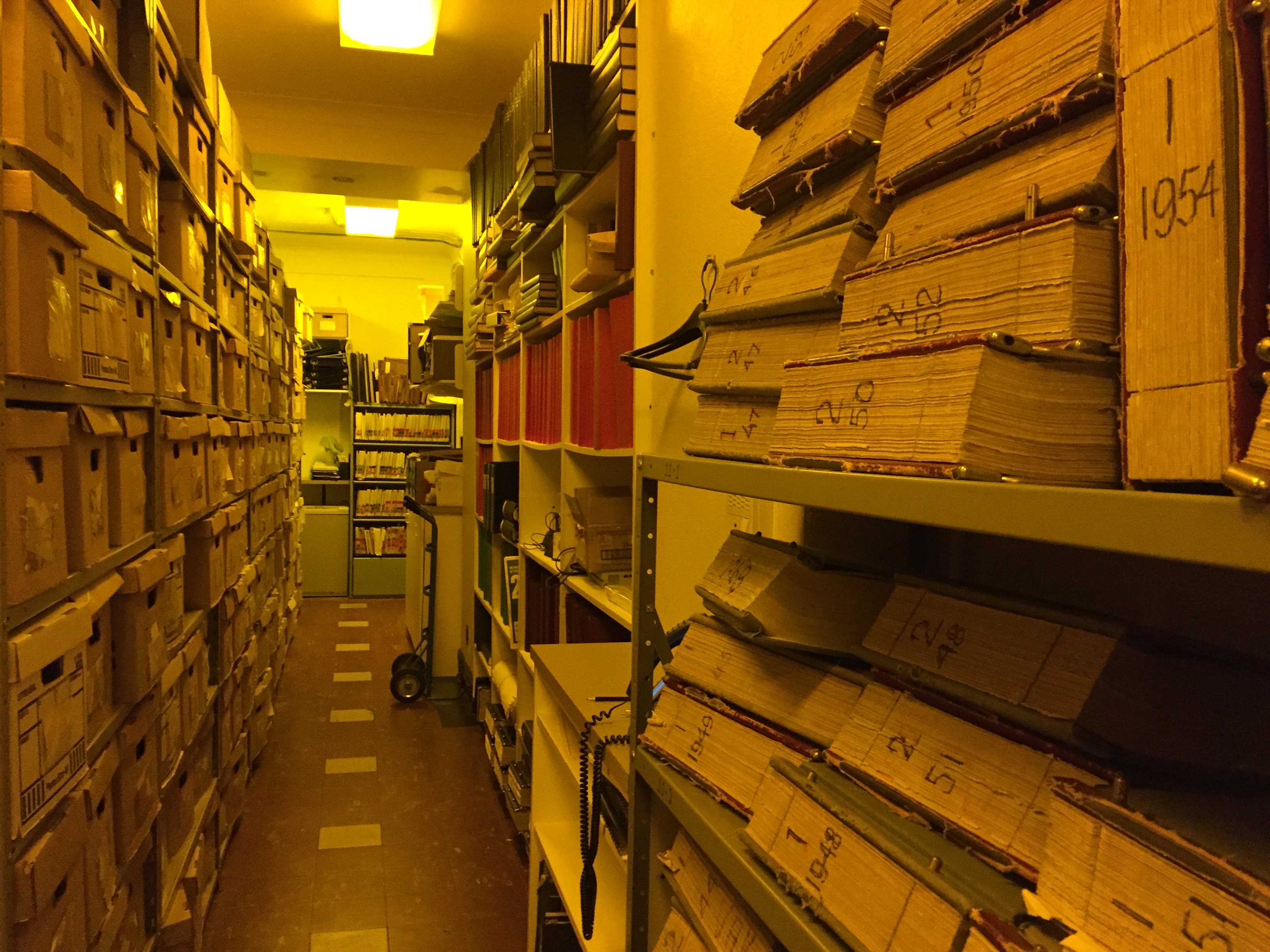 Environ 1000 boîtes blanches numérotées s’empilent dans cette pièce toujours bien tempérée et éclairée avec une lumière jaune afin d’aider à la conservation des documents. Au fond du local se retrouve un énorme cadre contenant une vue aérienne de Ville de Mont-Royal en 1938.
