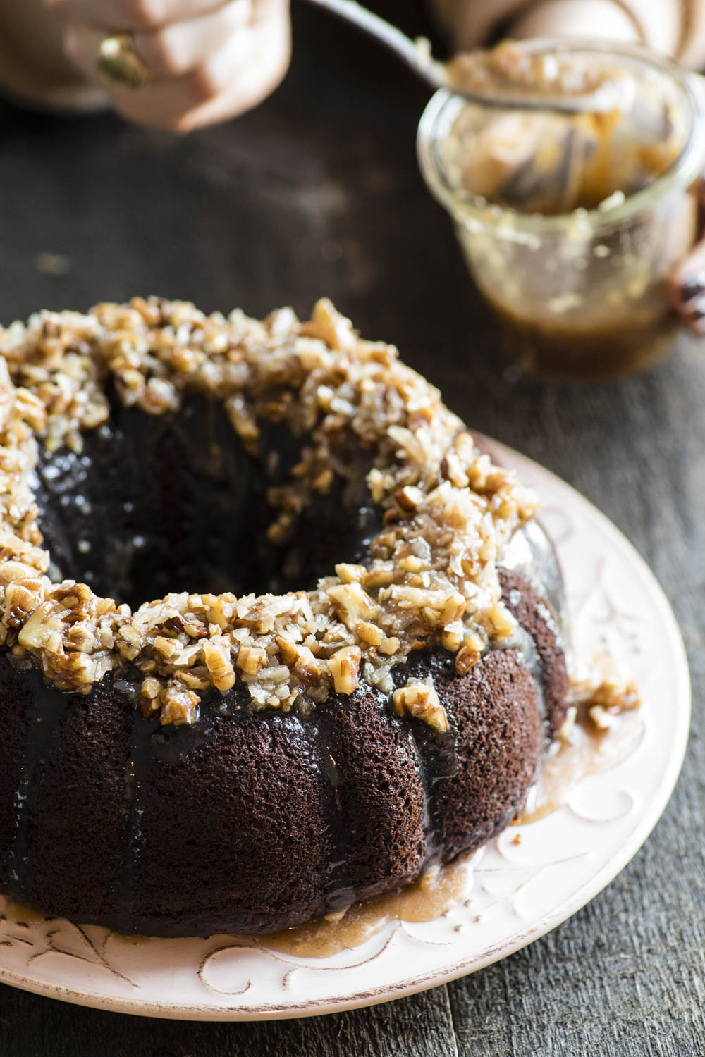 Gâteau chocolat-bananes sauce caramel aux pacanes et noix de coco