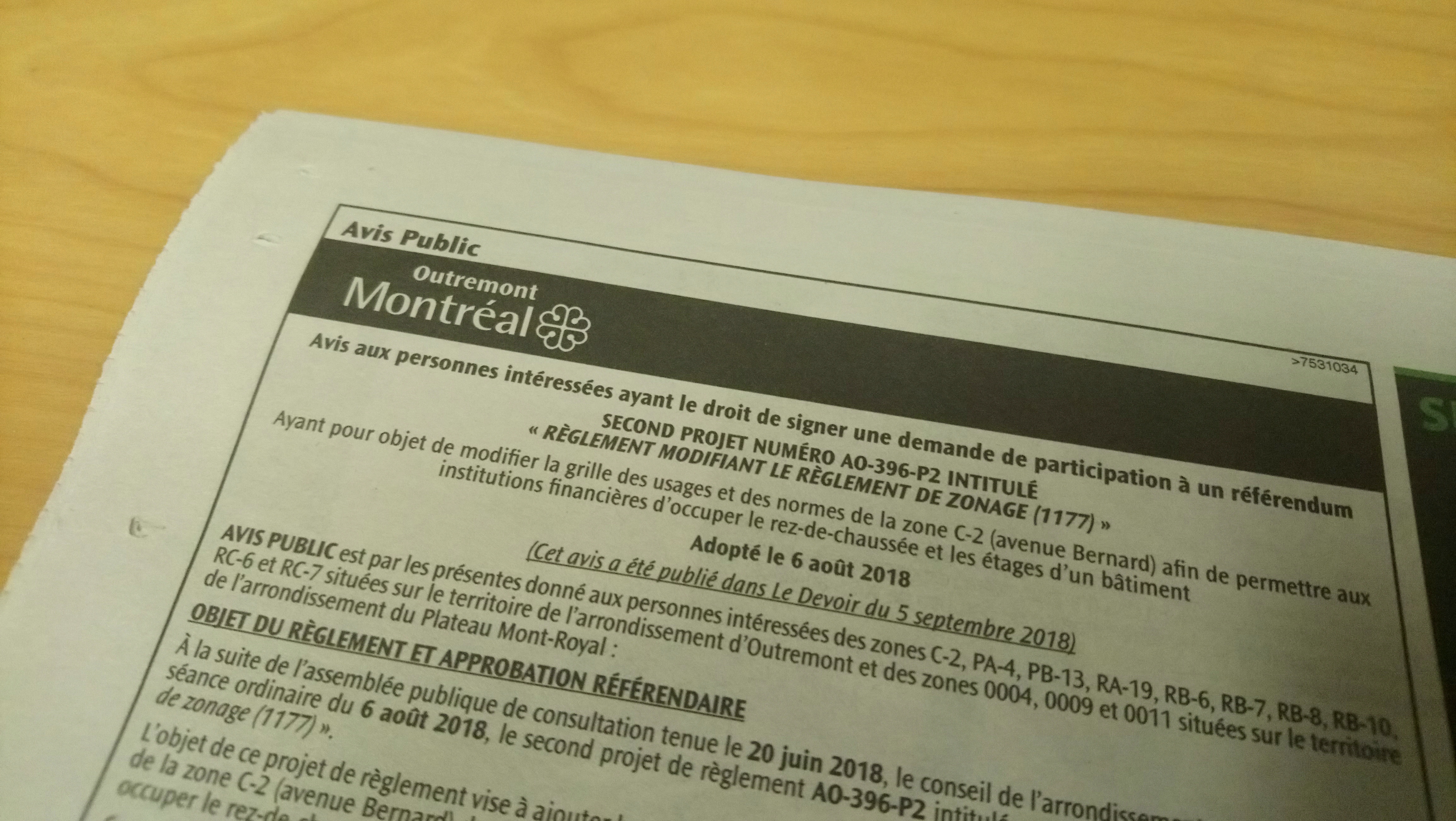 Outremont emboîte le pas vers le retrait des avis publics des journaux, dès novembre. Comme Rosemont-La-Petite-Patrie et LaSalle, l’arrondissement se tournera principalement vers le web pour une question de souplesse et afin d’économiser plusieurs milliers de dollars.