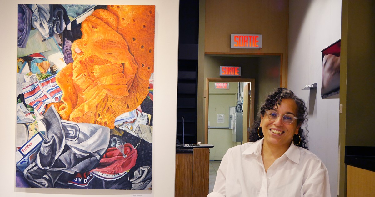 La peintre et graphiste Dana Edmonds remarque bien que des personnes qui n’ont pas l’habitude des galeries d’art viennent découvrir ses œuvres. Son commerce-atelier est situé au milieu du centre commercial Alexis Nihon, elle partage l’espace avec une autre artiste, Florence Gagnon. Paradoxalement, ses peintures abordent des thèmes sur la société de consommation. Dans ses compositions, on retrouve une multitude de déchets, assemblés telle une nature morte. Dans ses plus récentes œuvres, une figure humaine, la sienne, apparaît. Elle se penche également sur les sujets autour de la santé mentale, et son lien avec les déchets.