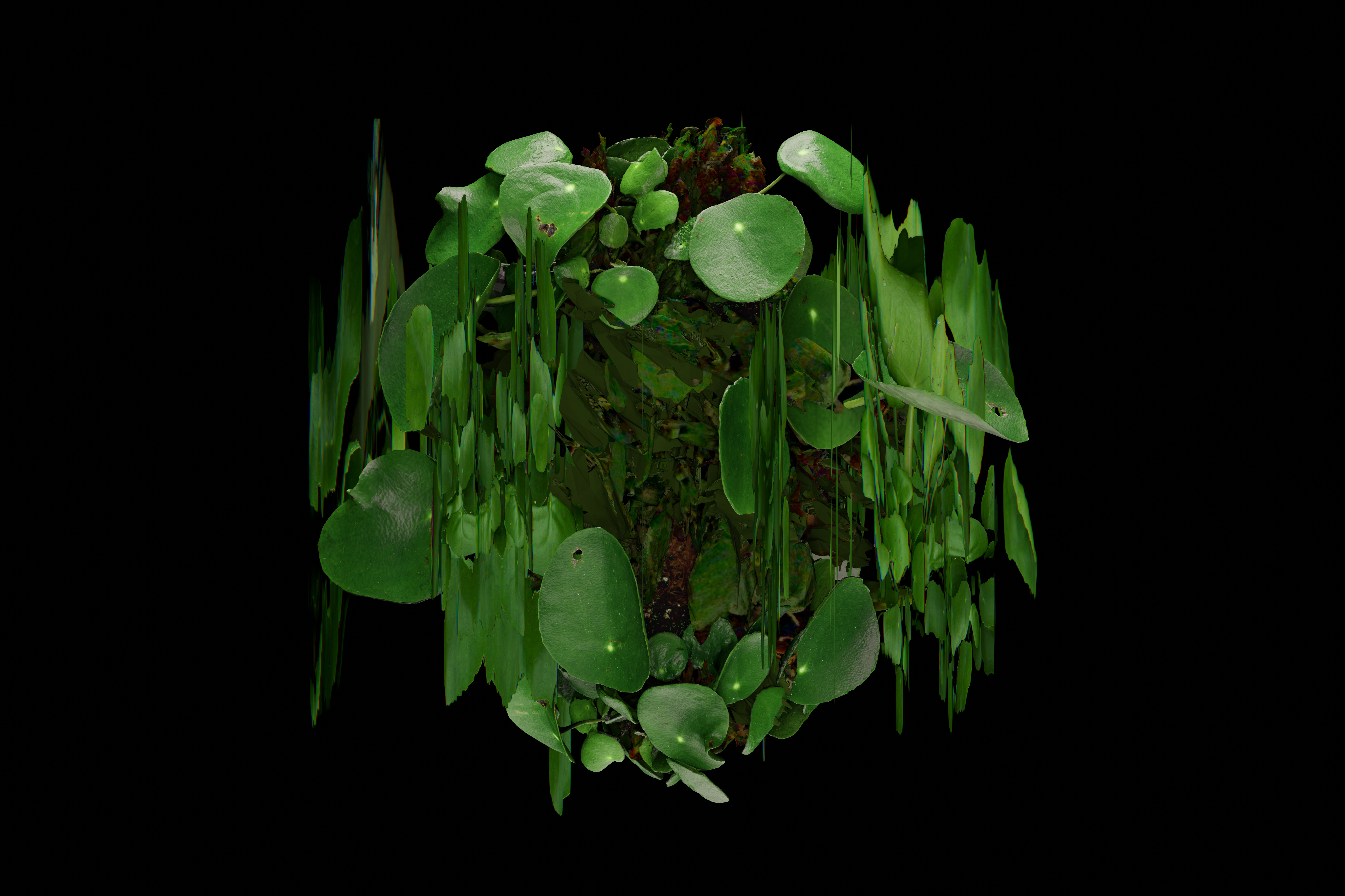 L’exposition de Katherine Melançon est concentrée au centre de la galerie Elektra. Un îlot de terre et de plantes est disposé au sol, et cinq écrans montrent une image qui mélange numérisation et imagerie 3D. La galerie est presque totalement plongée dans le noir, les sources lumineuses principales proviennent de quelques néons posés au milieu des feuillages et des écrans.