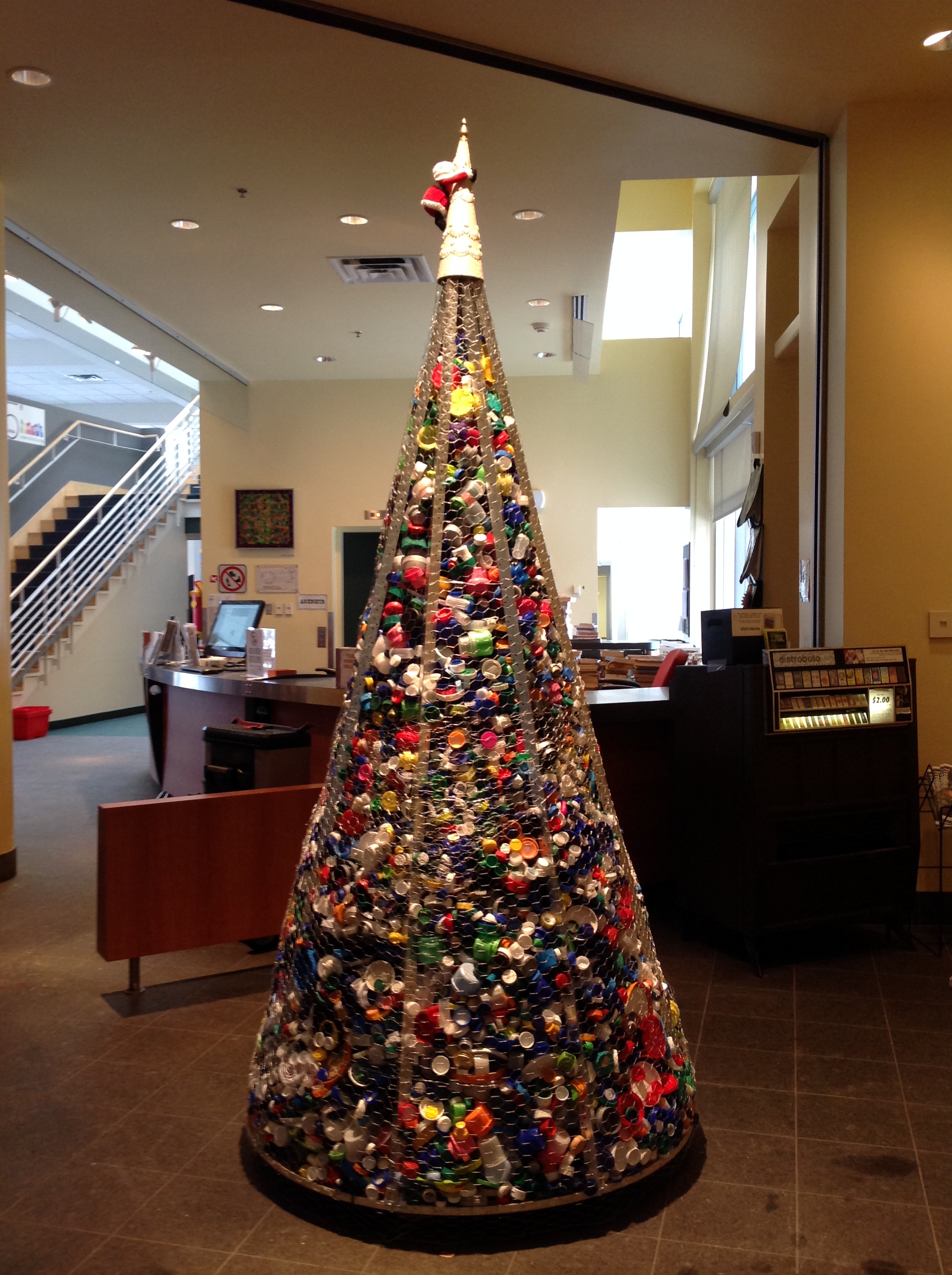 Laurent Bouchard, chargé des événements culturels à la Galerie d’Art d’Outremont (GAO) est aussi un artiste dans l’âme. Il vient de réaliser «grâce à la collaboration du public qui nous a apporté des milliers de bouchons de plastique», un arbre de Noël que chacun pourra voir dans l’entrée de la Bibliothèque Robert-Bourassa, 40, avenue Saint-Just à Outremont.