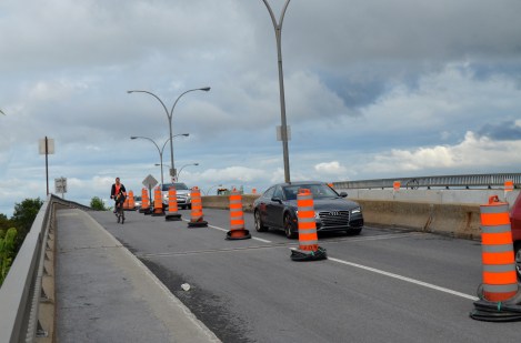En temps normal, la plupart des cyclistes qui traversent le viaduc partagent la chaussée avec les automobilistes puisqu’un seul trottoir est mis à la disposition des piétons et cyclistes sur cette infrastructure. Depuis mai, les cyclistes peuvent traverser de façon plus sécuritaire puisqu’ils ont, en quelque sorte, «leur voie réservée».