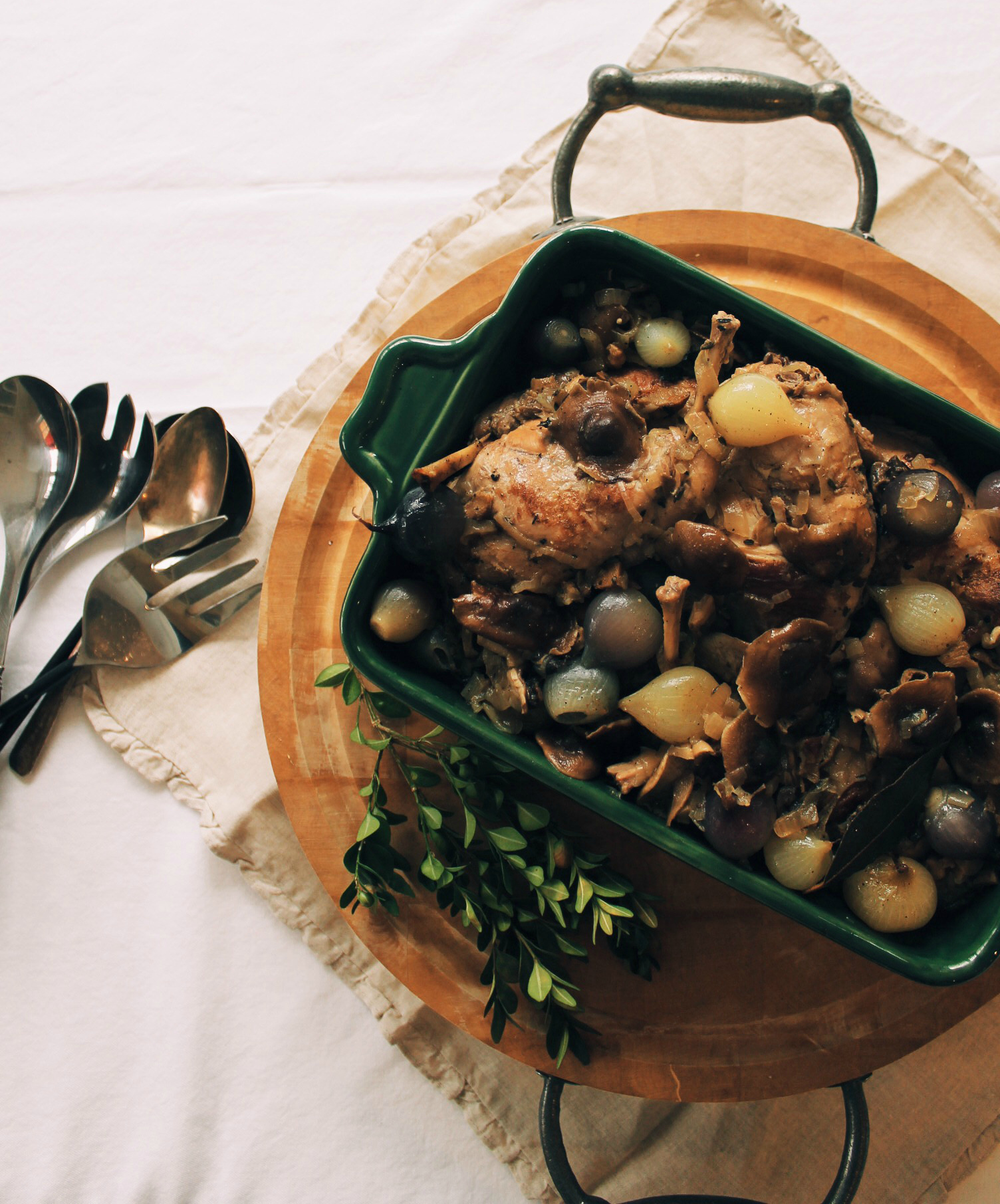 Prenons une recette de cuisses de poulet à la moutarde et aux champignons classique. Rien de compliqué à la rendre sans gluten ni produits laitiers! Pour la rendre plus festive, il suffit d’ajouter des champignons sauvages déshydratés et de troquer le poulet pour du lapin et le tour est joué! Les petits oignons perlés ajoutent aussi une touche visuelle intéressante qui n’est pas essentielle tous les jours.