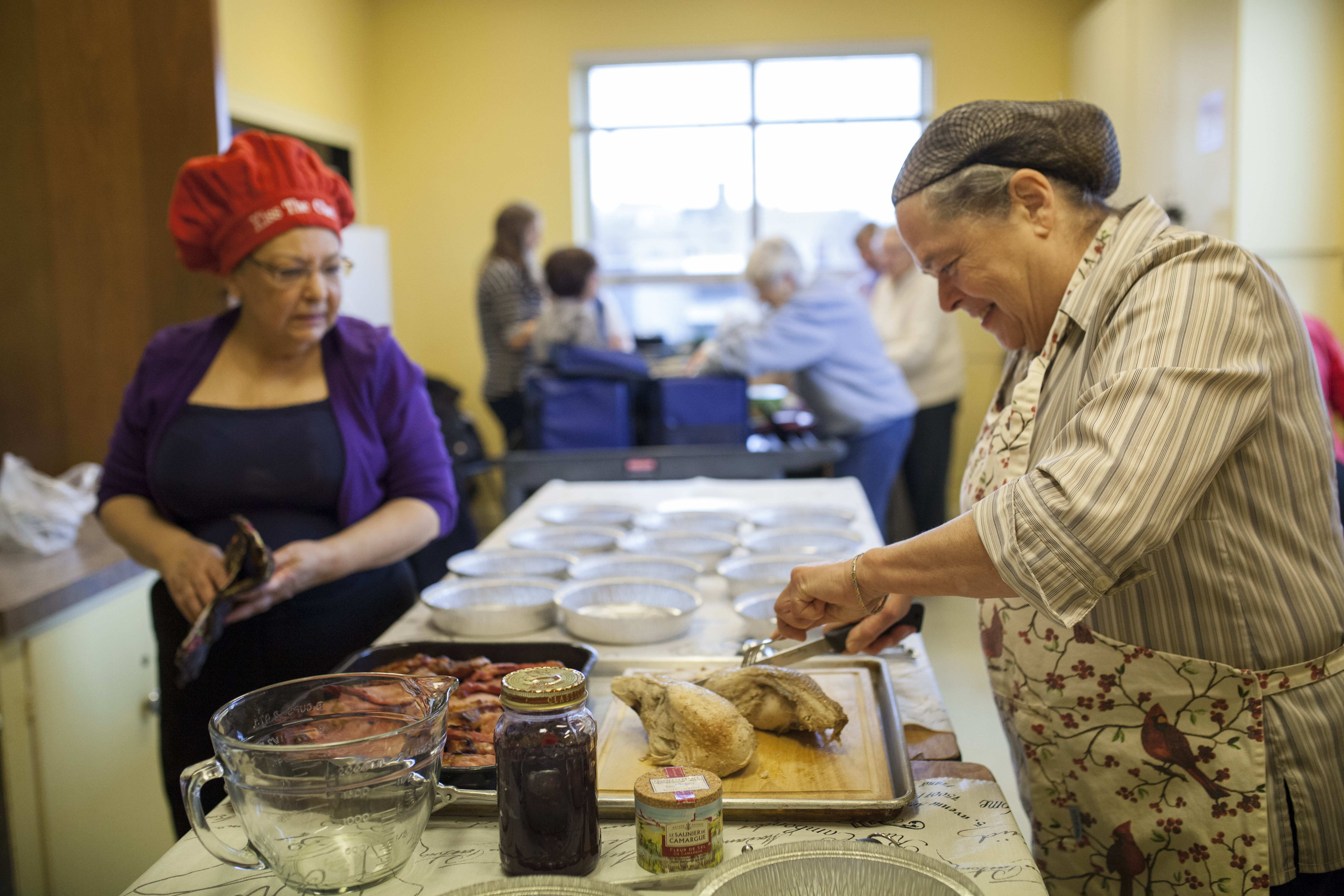 Les cuisinières de la Popote, visiblement honorées de couper la dinde aux côtés de Virginia, suivent ses indications à la lettre. Après tout, Virginia est la seule bénévole qui est là depuis l’arrivée de l’organisme à Ville de Mont-Royal.