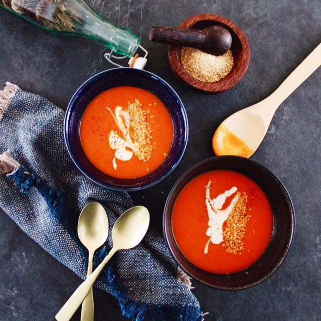 Pour la recette d’aujourd’hui, j’avais envie de couleurs vives sur la table. Je ne sais pas, peut-être l’appel du printemps! J’ai donc choisi des poivrons bien rouges à l’épicerie pour mousser la couleur du potage.