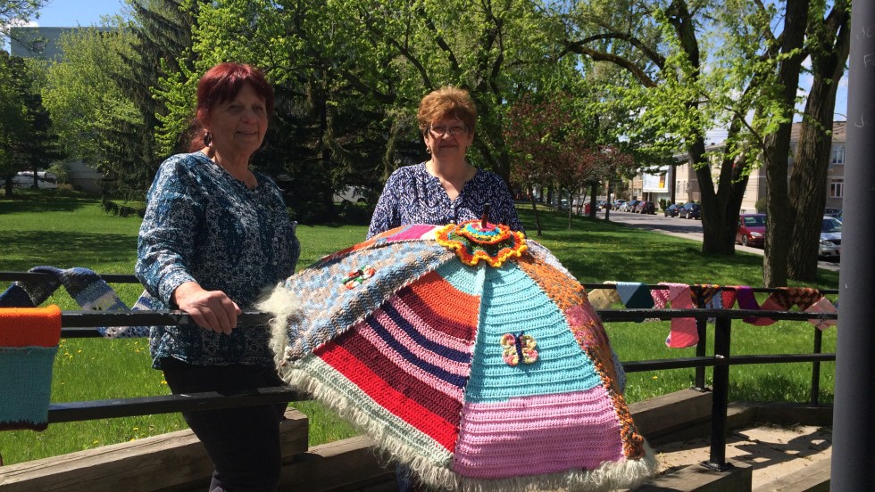 Devant leur chalet, situé dans le parc des Hirondelles, dans le Sault-au-Récollet, les fermières ont fait des graffitis. Ce sont en fait des tricots graffitis. Des morceaux tricotés spécialement pour