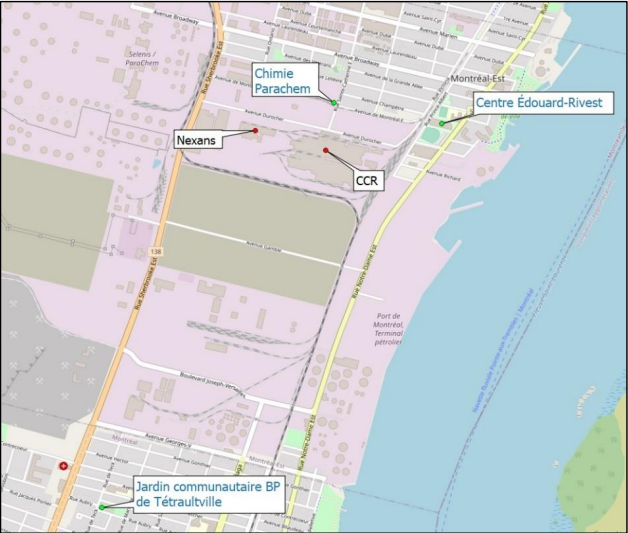 Entre 2019 et 2021, cette concentration moyenne est passée de 5,1 à 2,2 nanogrammes par mètre cube (ng/m³) pour la station du centre Édouard-Rivet, à Montréal-Est; de 5,4 à 4,1 ng/m³ pour celle située sur le terrain de Chimie Parachem également à Montréal-Est; et, enfin, de 2,8 à 1,0 ng/m³ selon les données recueillies à la station du jardin communautaire B.P. Tétreaultville dans l’arrondissement de Mercier─Hochelaga-Maisonneuve.