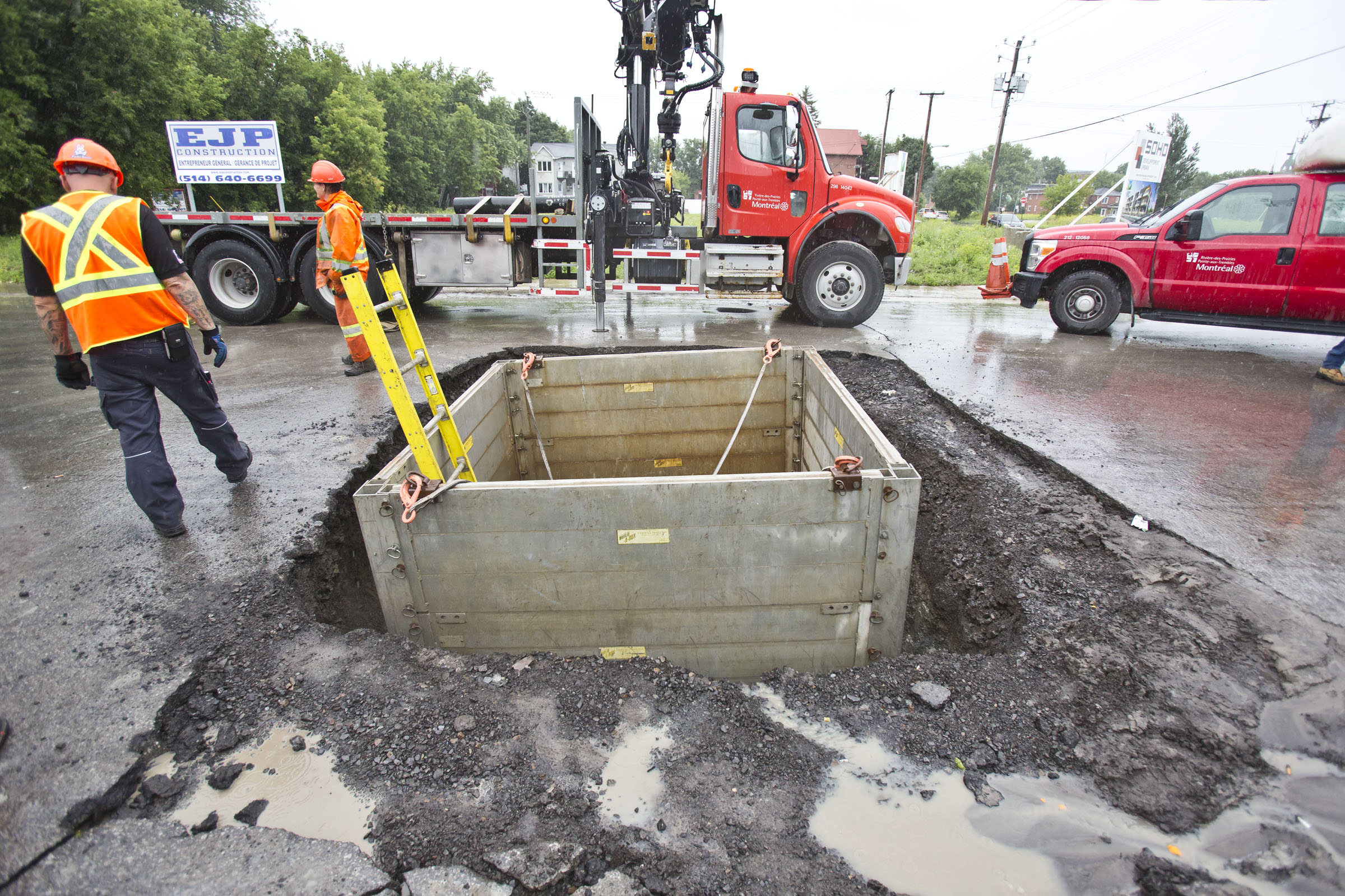 Bris de conduite de 8″ en fonte grise, datant de 1956. Aucun citoyen ne manque d’eau pour l’instant. Les travaux de réparation seront terminés aujourd’hui.