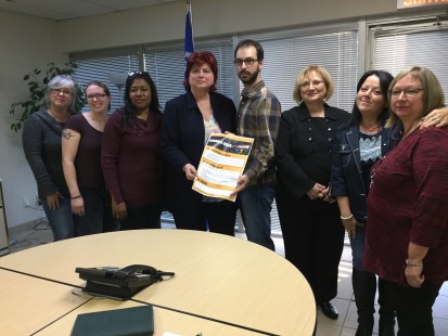 La députée de Pointe-aux-Trembles, Nicole Léger (4e à partir de la gauche) accepter de porter les revendications de dirigeants d'organismes communautaires de Pointe-aux-Trembles et Montréal-Est, le lundi 7 novembre 2016, au bureau de circonscription de Mme Léger, à Montréal.
