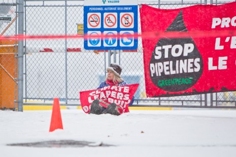 Des militants de Greenpeace se sont invités ce matin dans les installations du terminal de la Ligne 9b de Enbridge, au port de Montréal, en escaladant les tours utilisées pour charger le pétrole des sables bitumineux.
