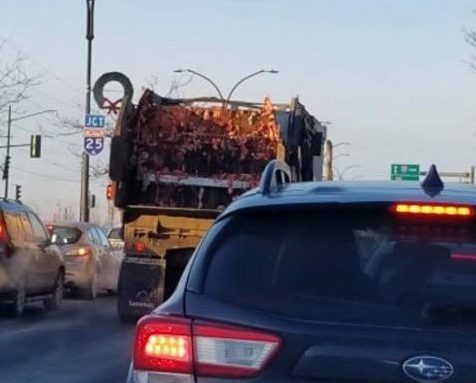 La photographie du camion, dont le chargement déborde, a été captée puis publiée sur Facebook par une automobiliste, le 20 février. L’image a suscité de nombreuses réactions hostiles envers Sanimax, l’usine d’équarrissage basée à Rivière-des-Prairies, qui traite abats, carcasses d’animaux et huiles usées. Leurs camions n’ont l’obligation de circuler qu’avec de simples bâches, provoquant ponctuellement des déversements sur la voie publique.