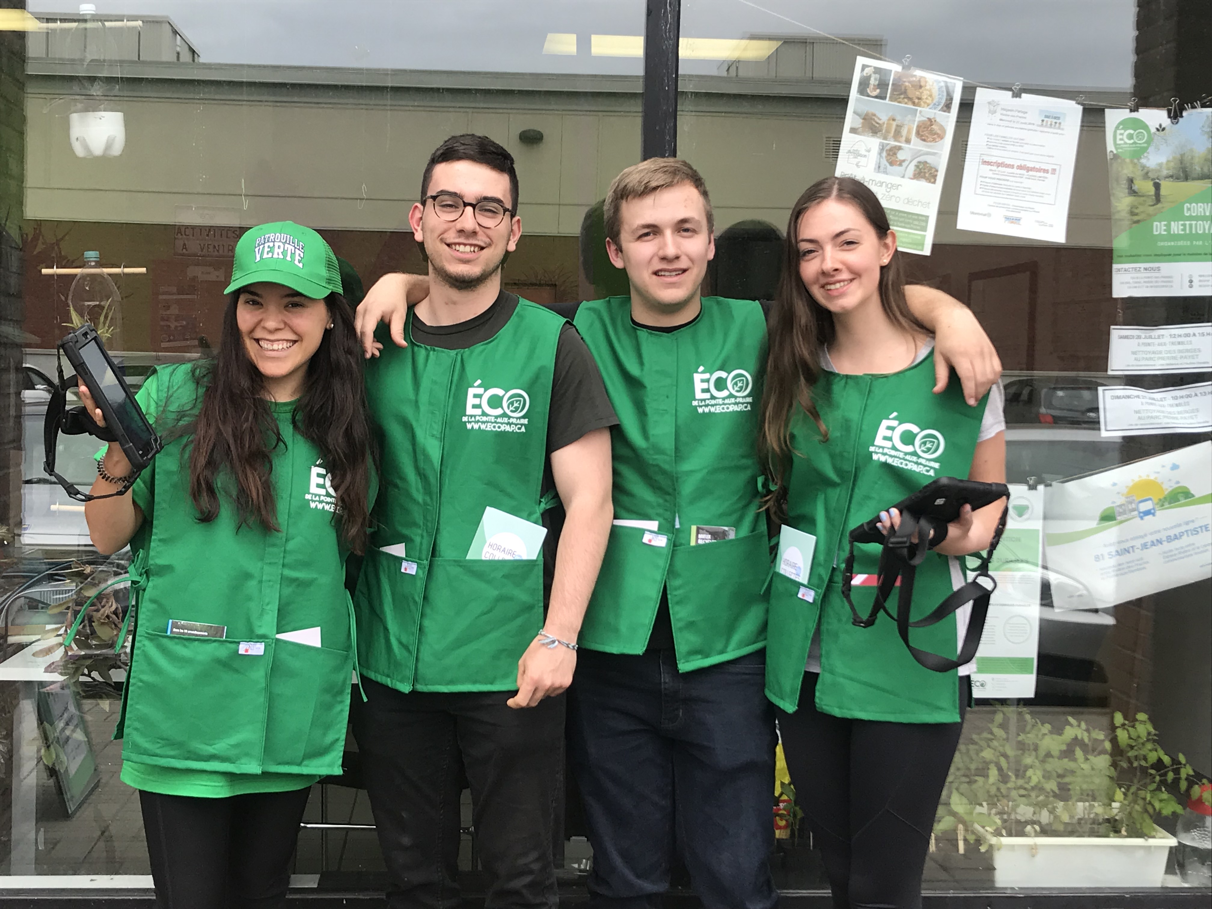 Josefa, Félix, Jessie et Thomas forment l’équipe qui couvre l’arrondissement de Rivière-des-Prairies – Pointe-aux-Trembles. En plus du porte-à-porte, ils participent à des activités de sensibilisation auprès des jeunes dans des camps de jour, et sont présents au kiosque de l’Éco de la Pointe-aux-Prairies du marché public de Pointe-aux-Trembles pour continuer leur mission.