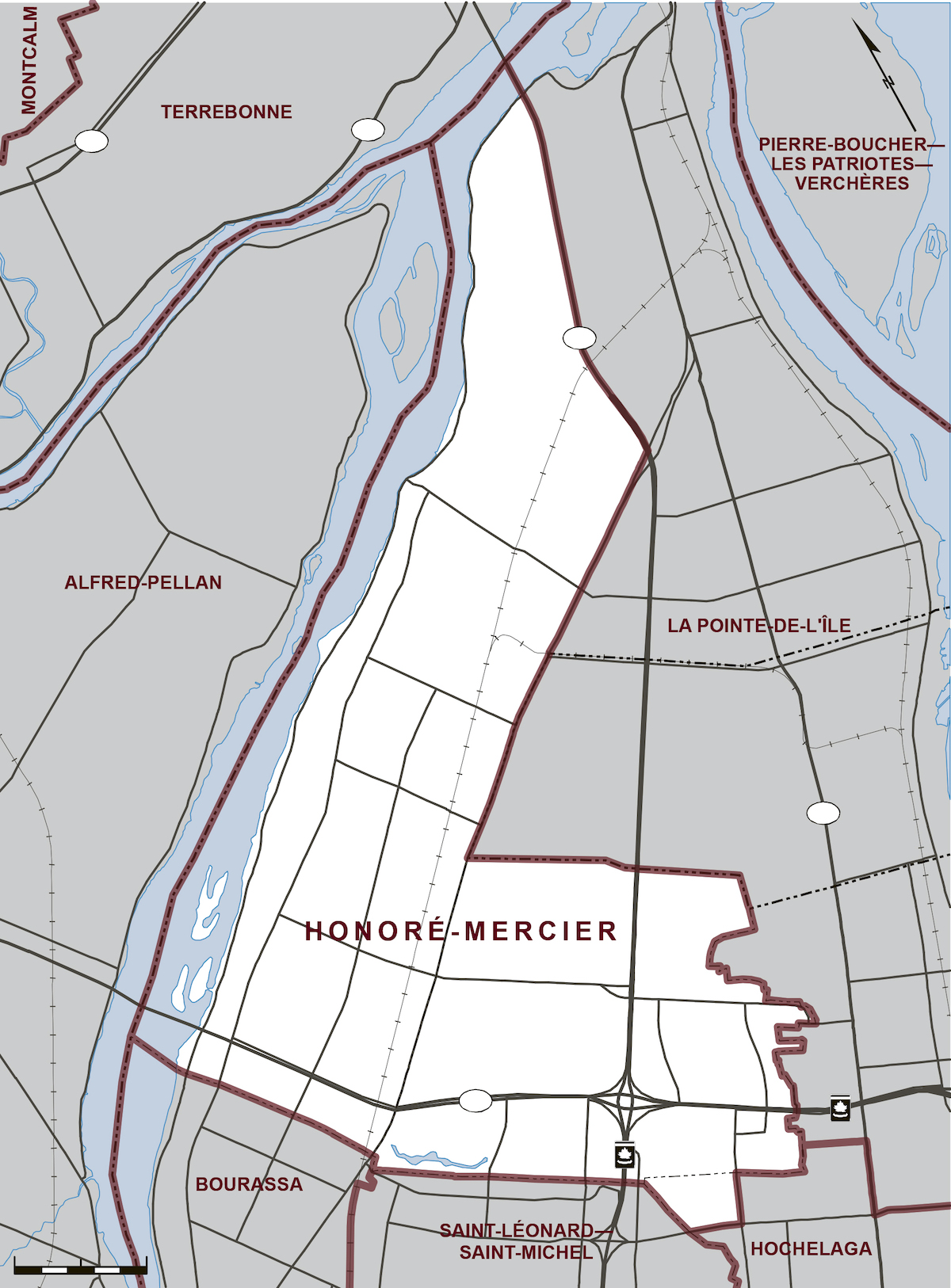 La circonscription Honoré-Mercier regroupe le district de Rivière-des-Prairies, Anjou et une partie de Mercier – Hochelaga-Maisonneuve. Elle compte environ 103 600 habitants et son député actuel, Pablo Rodriguez, tentera une sixième fois de remporter le siège à la Chambre des communes.