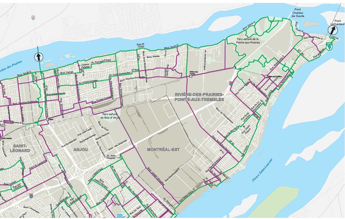Quelques pistes cyclables sont également prévues à Montréal-Est. La plus importante suivra le tracé du futur boulevard Joseph-Versailles jusqu’au-delà de l’autoroute 40. Les avenues Broadway, Marien et Richard ainsi que les rues Victoria et René-Lévesque seront aussi desservies.