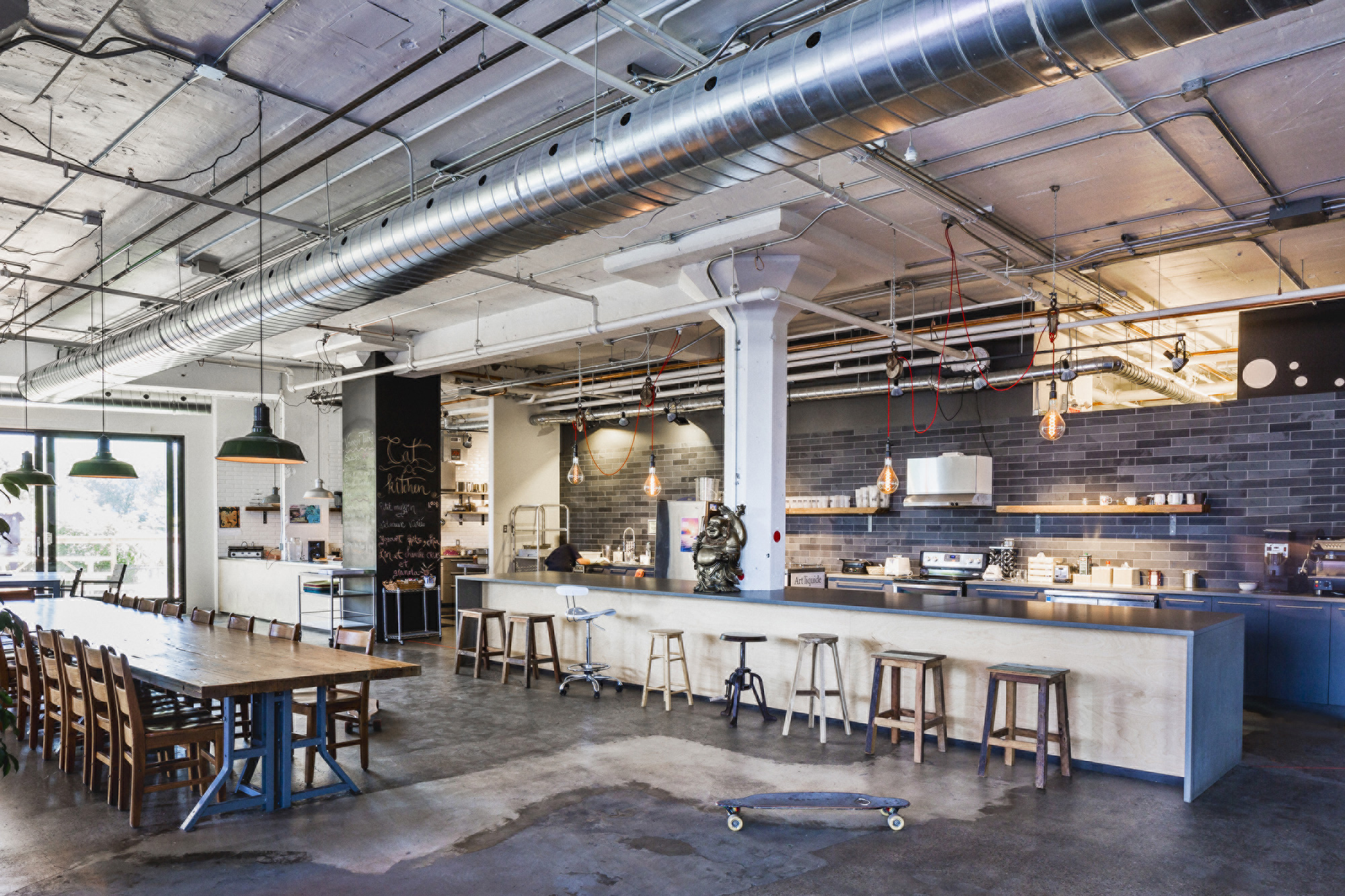 On accède à ces nouveaux bureaux par un escalier en acier noir, une porte d’entrée volontairement minimaliste et discrète, à la demande de Moment Factory. Une fois la porte franchie, on se retrouve déjà au cœur de l’action, dans une cafétéria aérée de style industriel où un espace cuisine à aire ouverte vole la vedette.