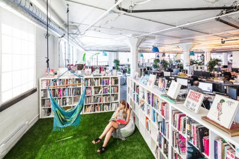C’est toutefois à l’étage que sont installés la majorité des employés. Dans cet espace ouvert inondé de lumière naturelle, les zones de travail ont été délimitées par des plantes, des bibliothèques et des panneaux colorés.