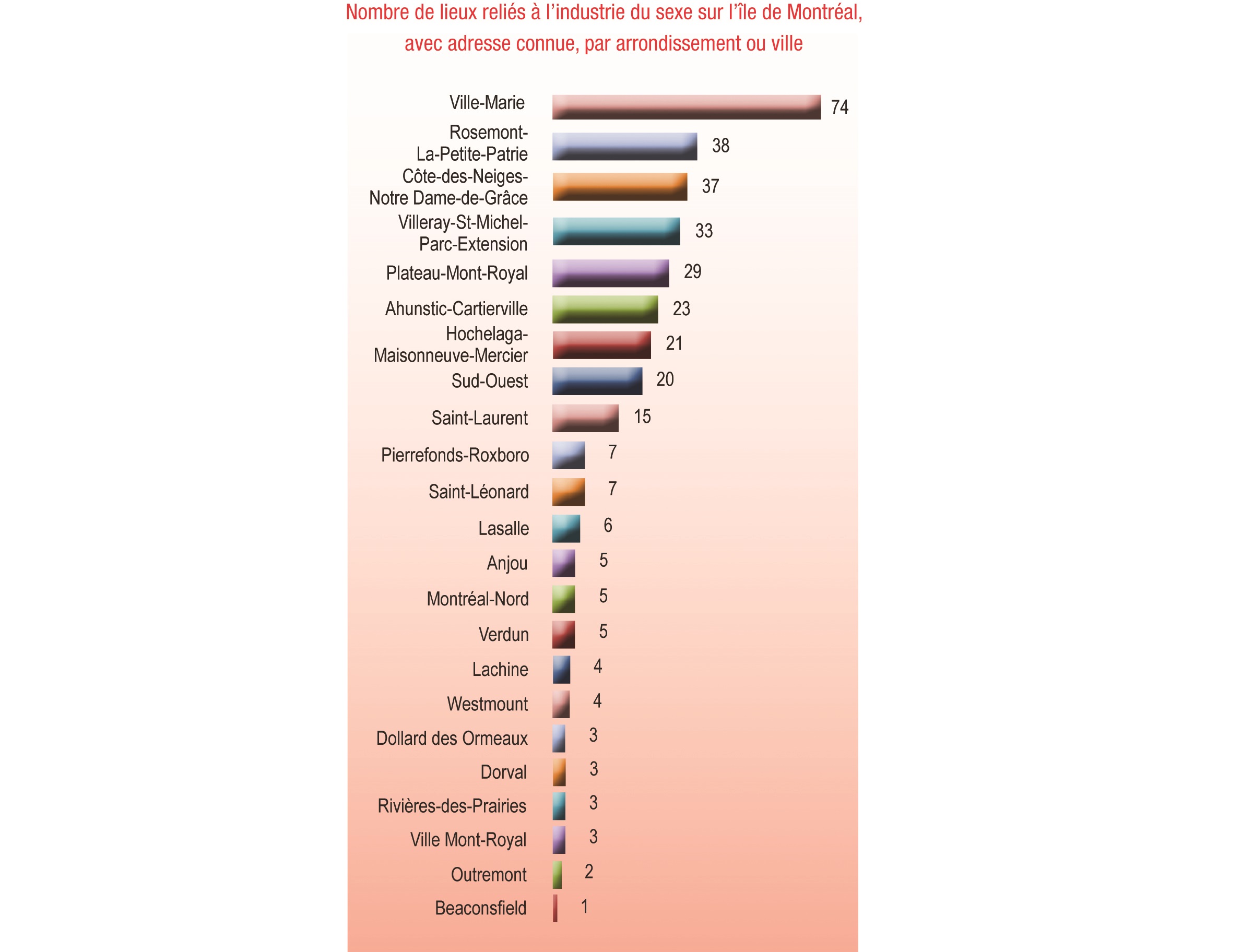 Le phénomène est par ailleurs bien implanté dans Rosemont – La Petite-Patrie, car il s’agit du deuxième arrondissement où l’on trouve le plus de lieux reliés à l’industrie du sexe sur l’île de Montréal, après Ville-Marie, selon les données collectées en 2014 par à la Concertation des luttes contre l’exploitation sexuelle (CLES).