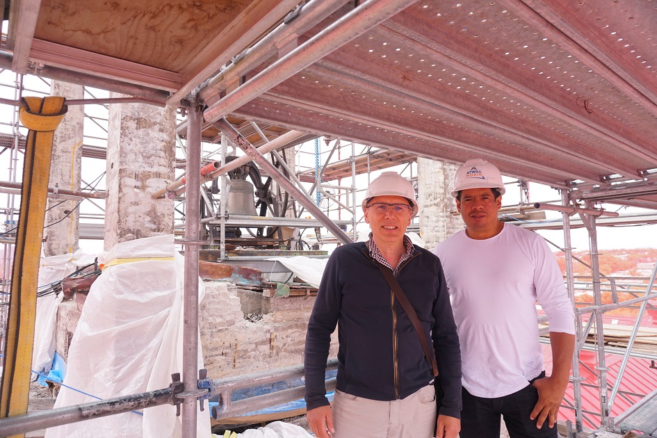 Le haut du clocher, c’est-à-dire son toit en cuivre et la partie qui soutient la cloche, sera prêt pour Noël. Il faudra ensuite refaire la partie basse du clocher, celle qui comporte les vitraux. « On ne pense pas tout terminer parce que nous n’aurons pas les budgets nécessaires. Donc ça va être comme une première phase de restauration », conclut M. Dion.