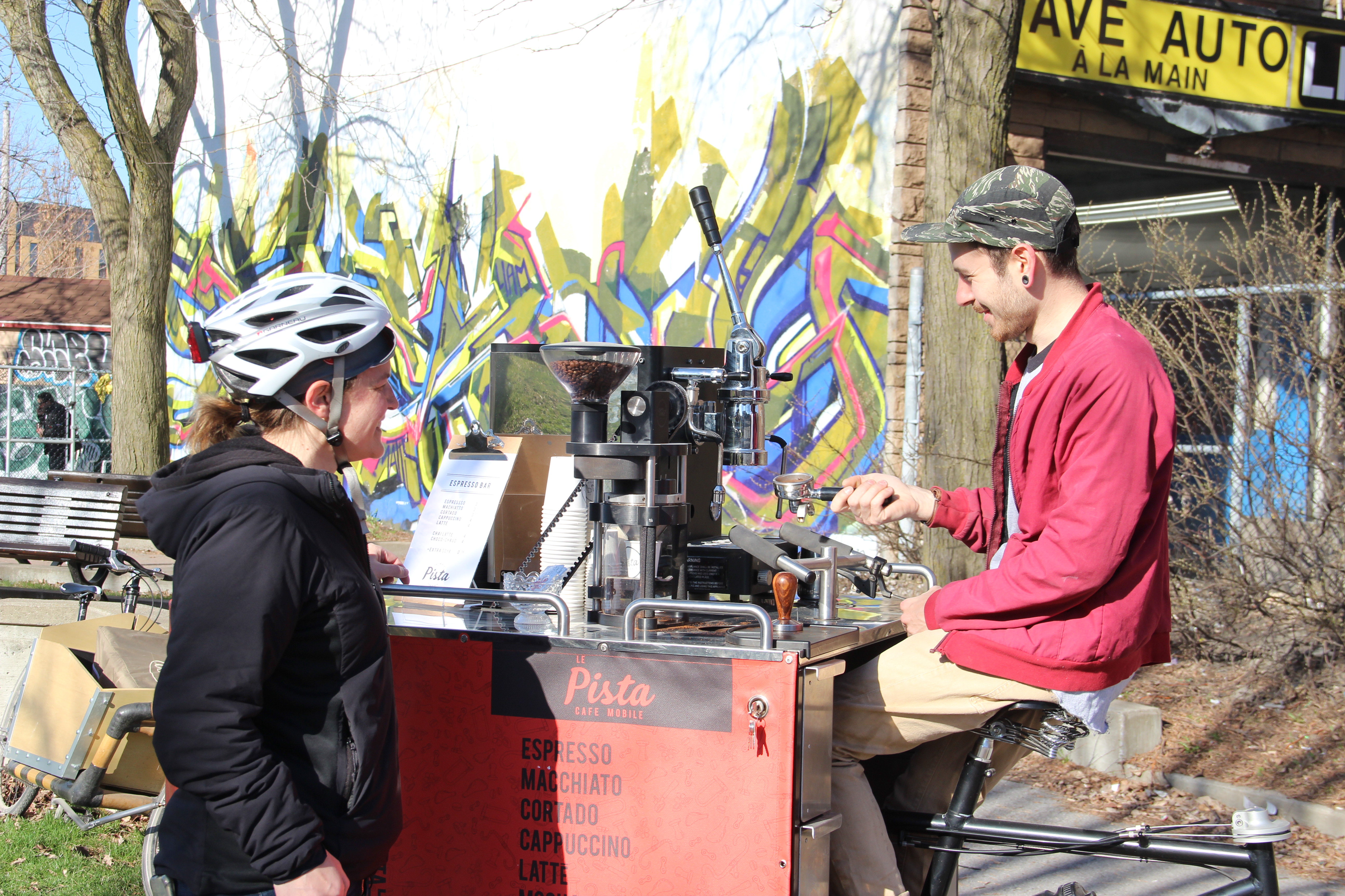 Il faut avoir un peu de flair pour trouver le Café Pista. Se laisser guider par la douce odeur du matin, celle du café. Avec le beau temps, Maxime, propriétaire, n’a pas hésité à sortir son tricycle et s’installer au coin de l’avenue Christophe-Colomb et de la piste cyclable.