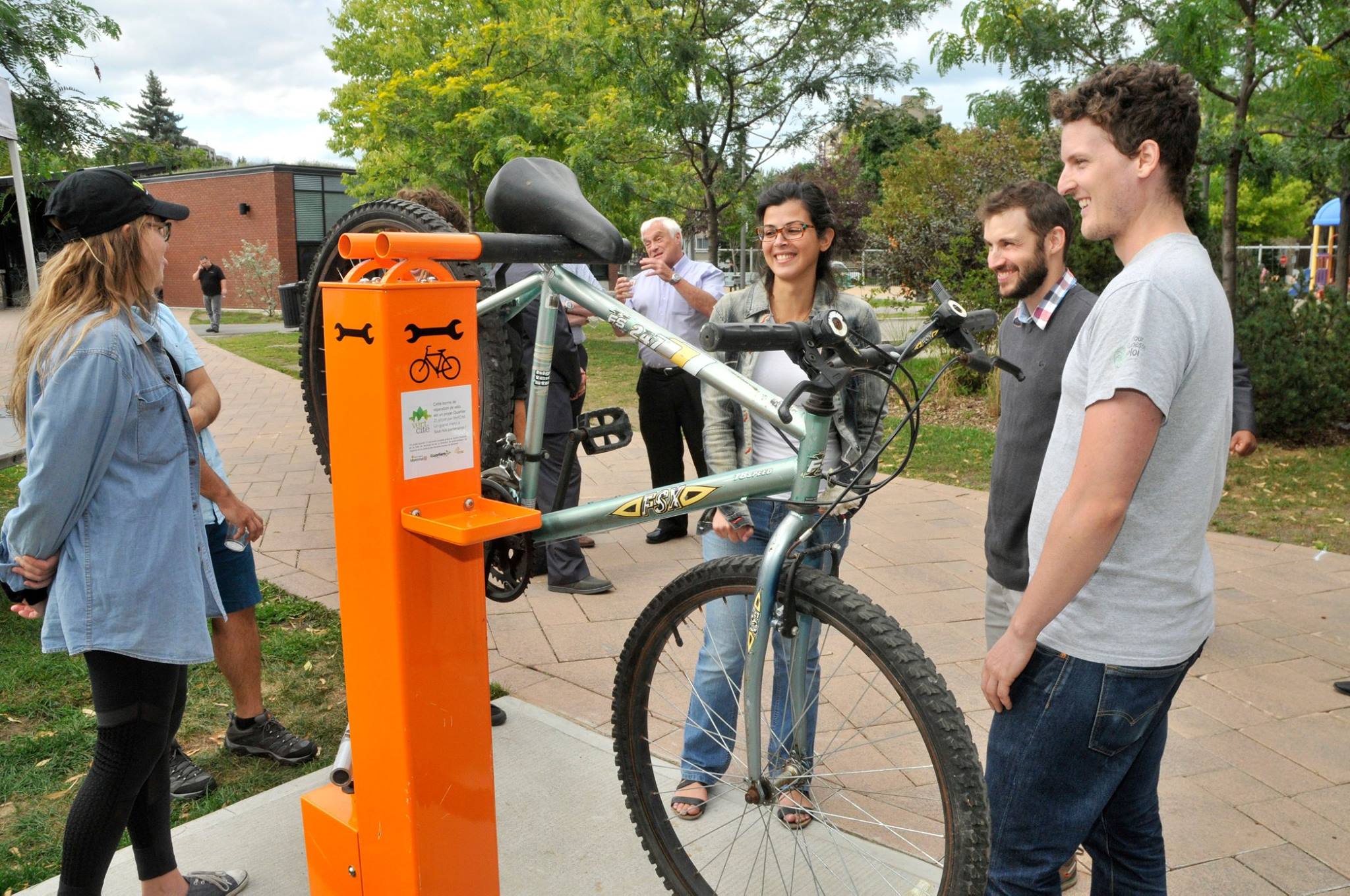 La première Biciborne de Saint-Laurent permet de réparer les vélos au parc Painter grâce à un jeu de tournevis et de clefs ainsi qu’une pompe. Cette station de travail en libre-service est une initiative de VertCité, de Quartiers 21, de la RUI Chameran-Lebeau et du Carrefour jeunesse emploi (CJE) Saint-Laurent.