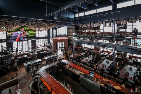 L’avion est parti, recyclé dans un paintball, mais les références aux sports sont toujours là. Une mosaïque de bâtons de hockey fait office de chandelier tandis qu’un mur de briques peint rappelle un terrain de football. Pour suivre le direct, 21 télévisions s’ajoutent aux deux murs d’écrans.
