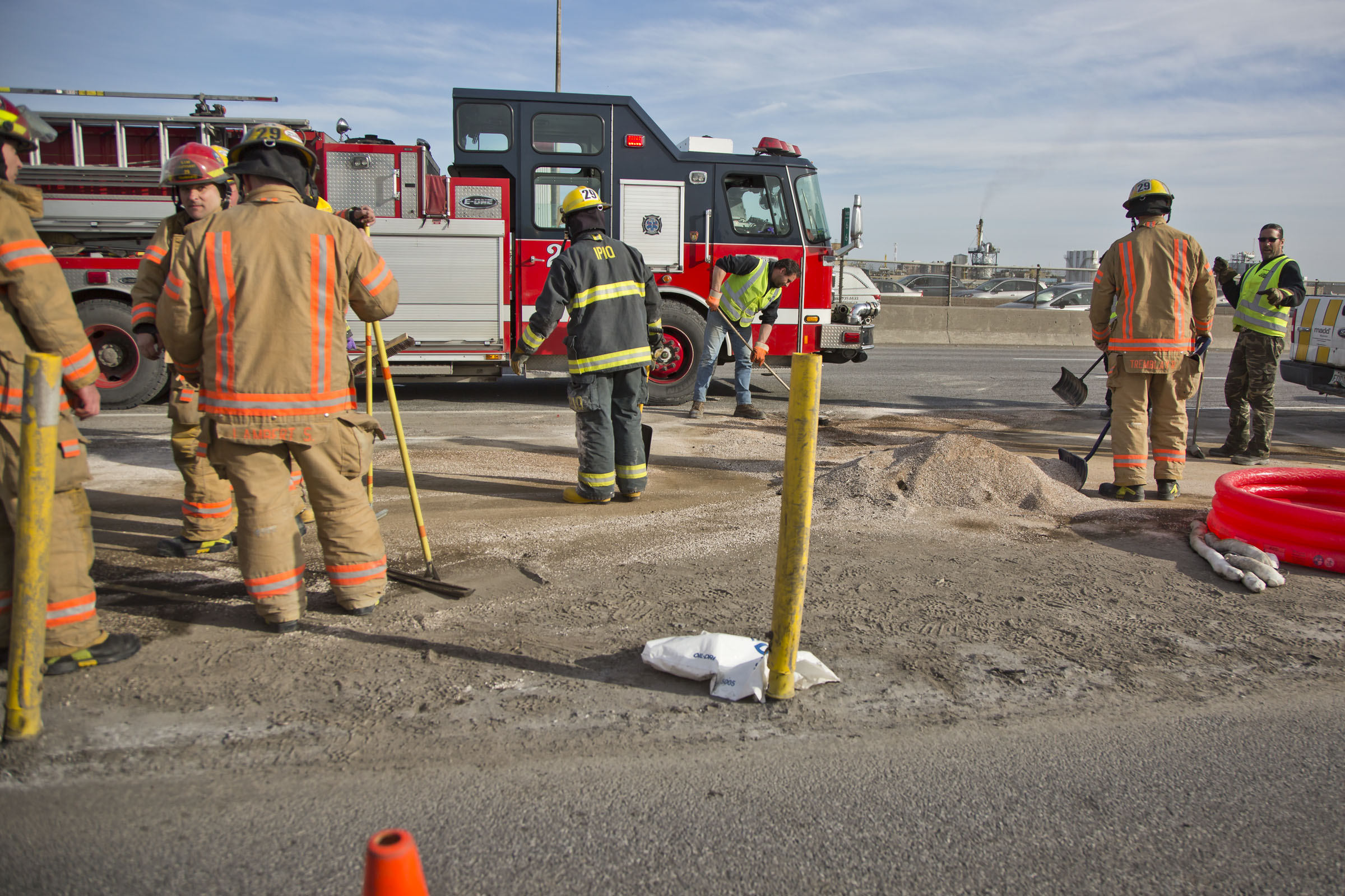 Pour permettre à Urgence Environnement ainsi qu’aux pompiers de répendre de l’absorbant, la voie de droite ainsi que la sortie 65 sont fermées.