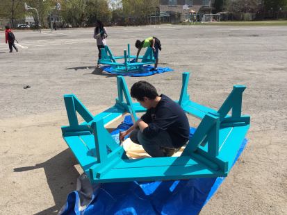 La cohorte a produit et peint des tables à pique-nique de différentes formes en bleu et jaune aux couleurs de l’école. Ils ont aussi planté des arbres, créé un jardin de pollinisateurs et préparé un potager. La Société de verdissement du Montréal métropolitain (SOVERDI) les a soutenus pour les plantations, et des bénévoles de la RBC et du Groupe ALDO notamment sont venus leur prêter main-forte. Une partie de l’asphalte va également être refaite.