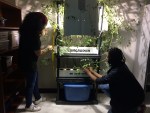 À la suite d’une courte formation, les adolescents ont fabriqué leur propre système sur une étagère. Un bac d’eau additionné de nutriments alimente trois tablettes de plants de tomates et de basilic éclairés par une lampe.