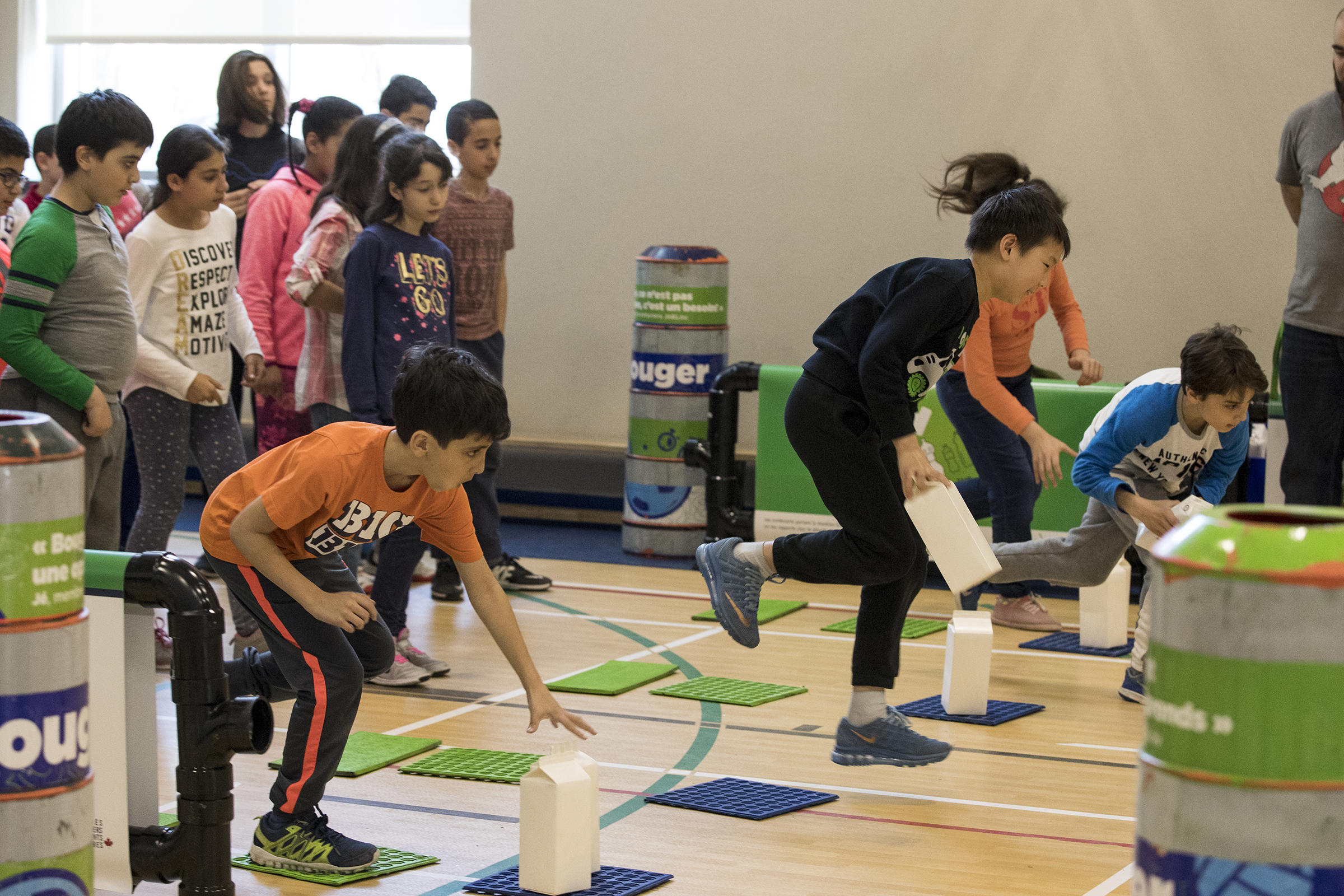 Le gymnase de l’école primaire des Grands-Êtres de Saint-Laurent a été transformé en parcours de jeux la semaine dernière afin de sensibiliser les plus de 450 élèves à la nutrition, l’activité physique, la diversité culturelle et l’environnement. Ils ont aussi eu l’occasion de se familiariser, de manière ludique, avec la récupération des contenants consignés.